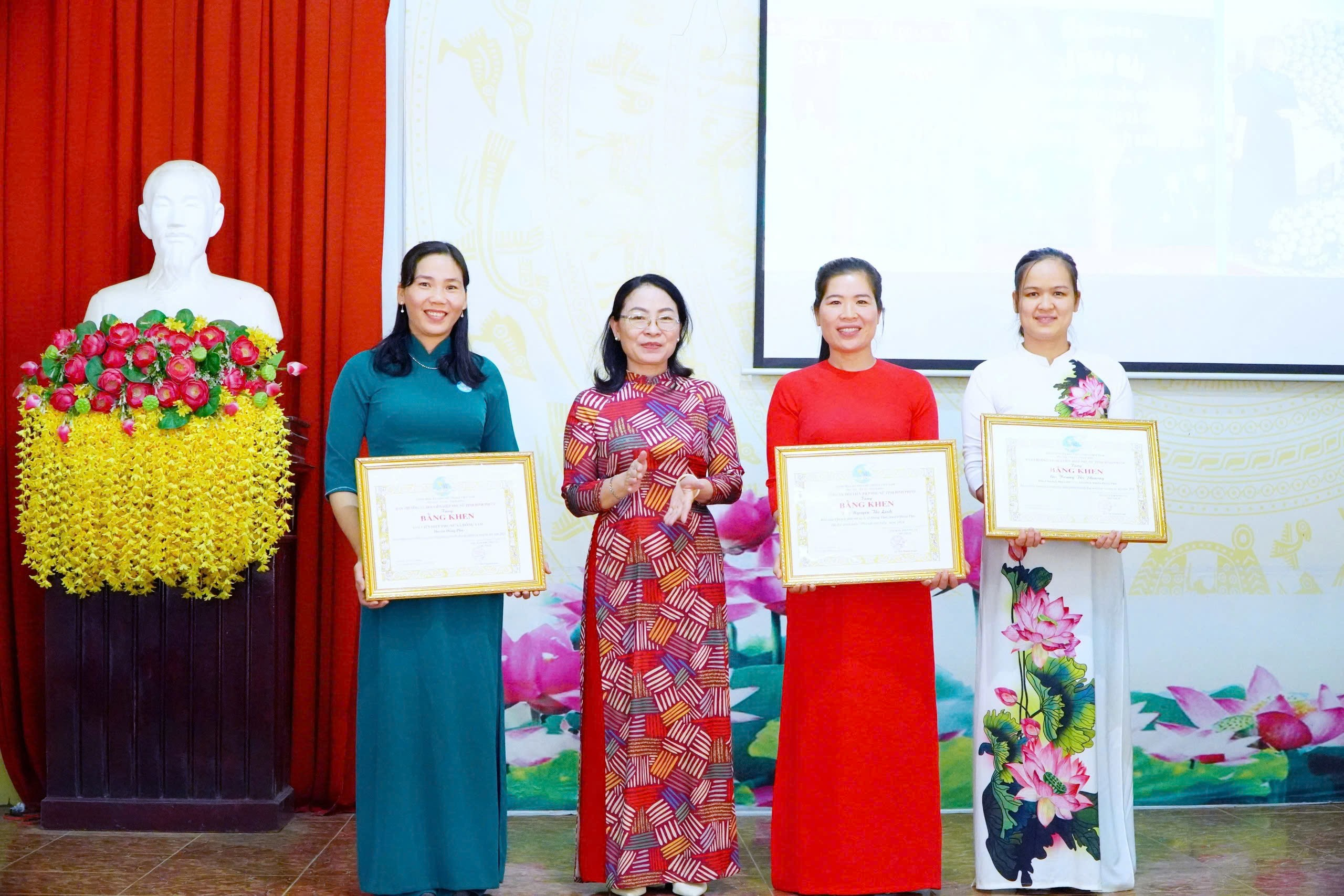 Chị Nguyễn Thị Linh (giữa) nhận bằng khen của Hội Liên hiệp Phụ nữ tỉnh Bình Phước