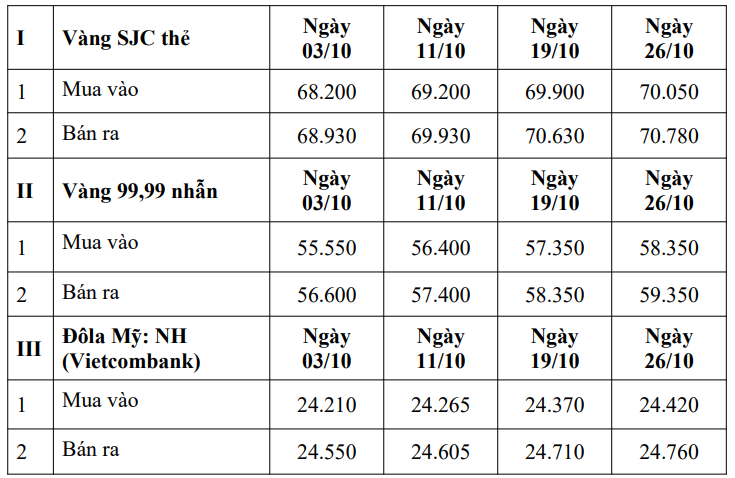 Diễn biến cụ thể giá vàng, đô la Mỹ trong tháng 10/2023 (đơn vị tính: ngàn đồng/lượng, đồng/USD)