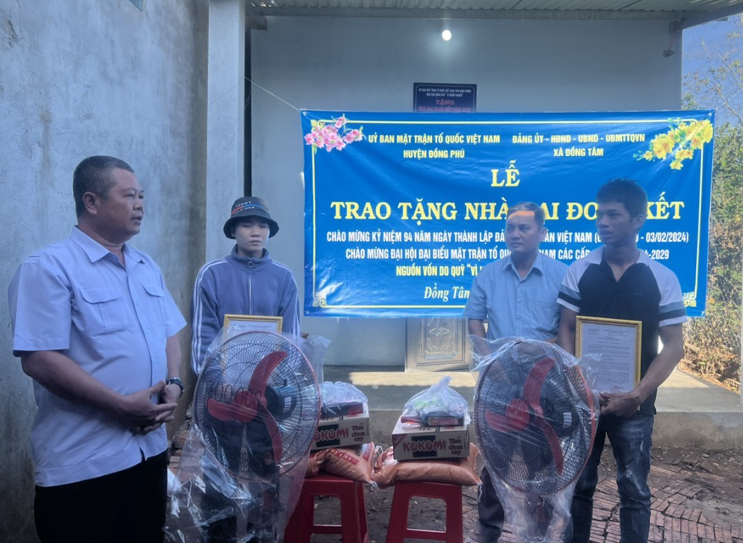 Thiết thực chào mừng đại hội MTTQ các cấp, nhiệm kỳ 2024-2029, sáng ngày 17-01-2024, Phòng Dân tộc huyện Đồng Phú phối hợp Đảng ủy, HĐND, UBND, UBMTTQVN xã Đồng Tâm đã tổ chức Lễ trao tặng 02 căn nhà Đại đoàn kết cho hộ nghèo, đồng bào DTTS trên địa bàn xã.