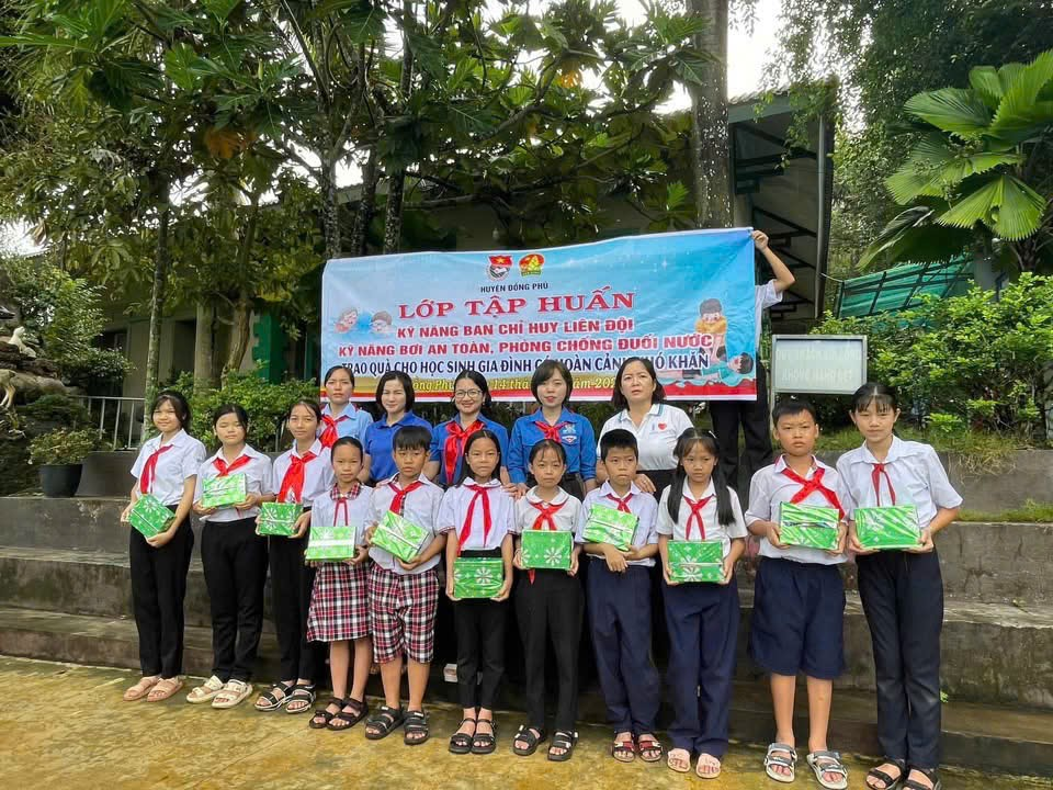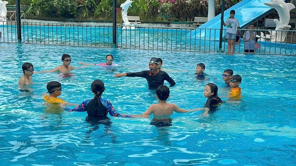 Các em học sinh được hướng dẫn kỹ năng bơi an toàn