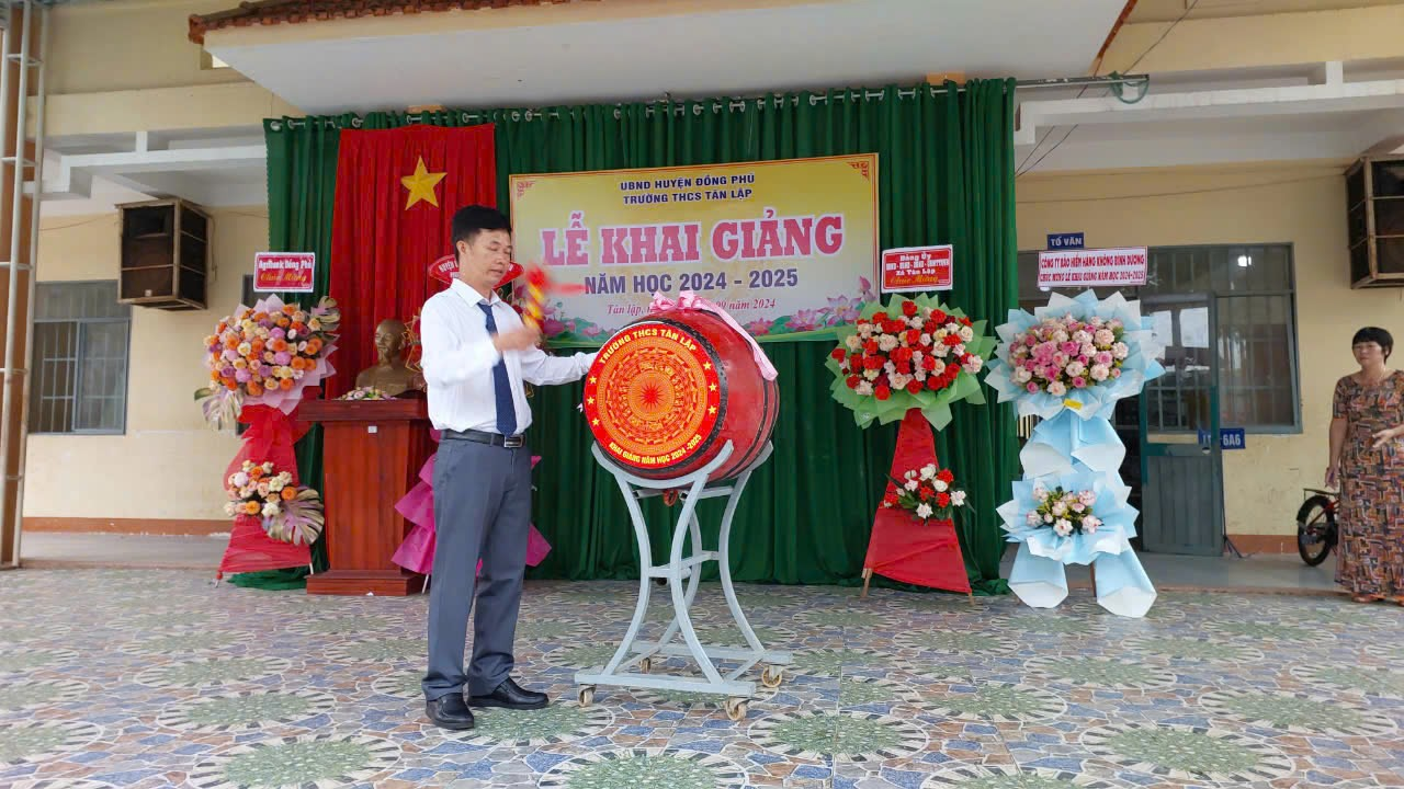 Thầy Nguyễn Hoàn, Hiệu trưởng Trường THCS Tân Lập đánh trống khai trường.