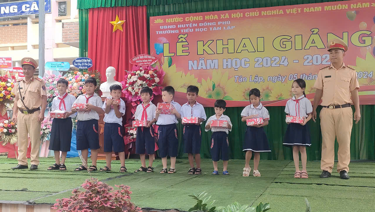 Phòng cảnh sát giao thông Công an tỉnh tuyên truyền an toàn giao thông và tặng quà cho học sinh tại Trường Tiểu học Tân Lập.