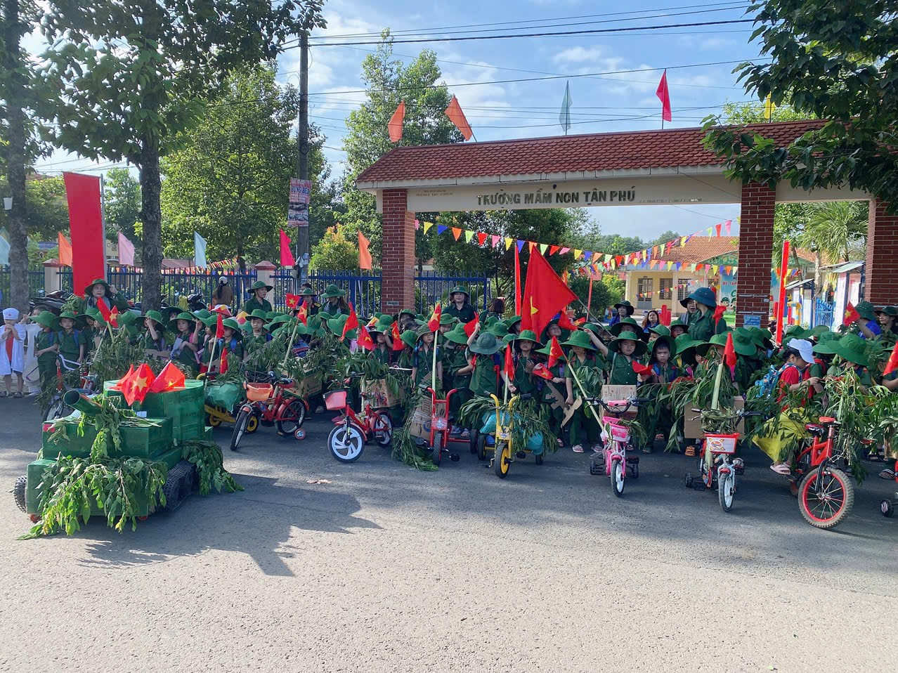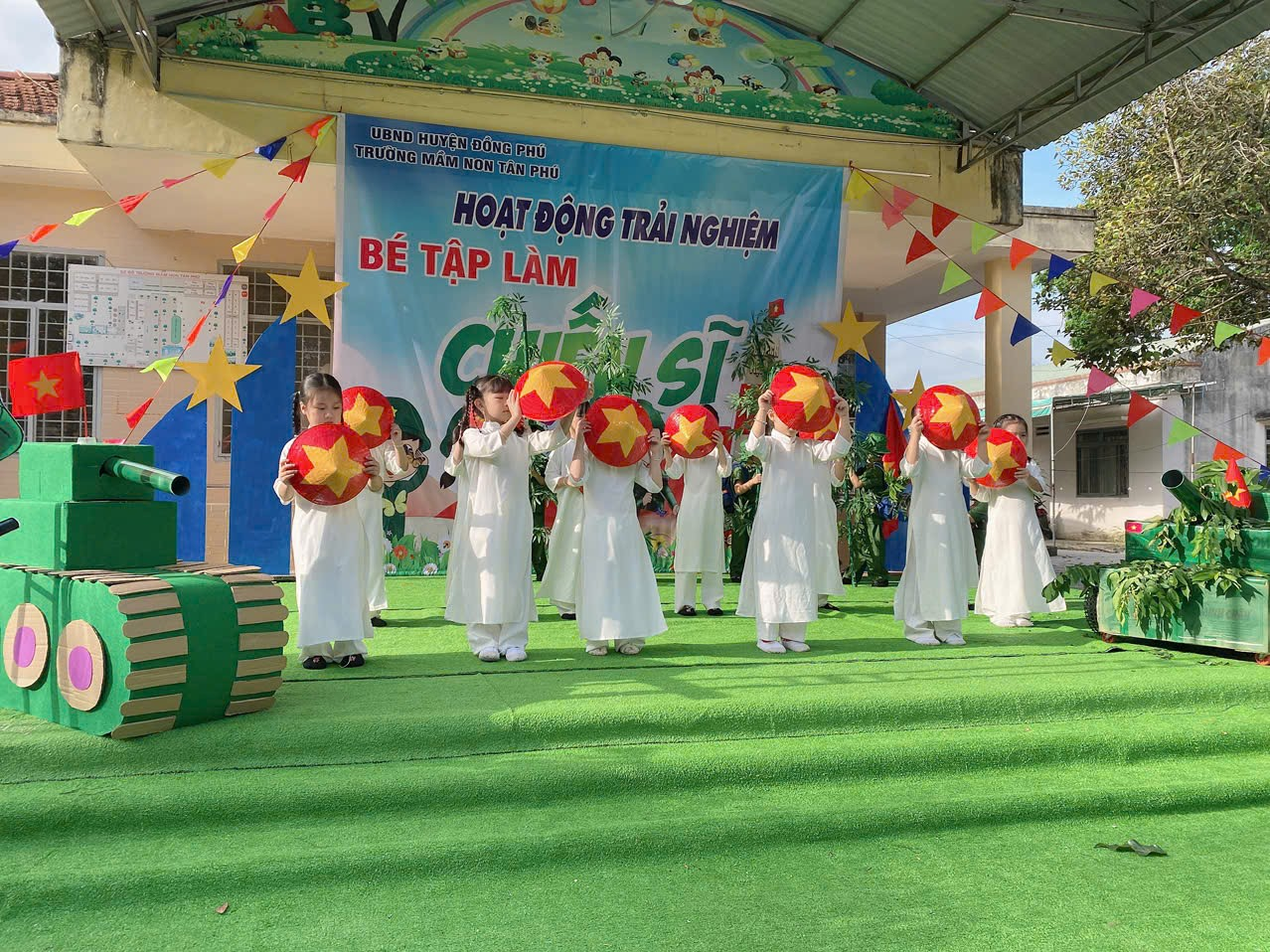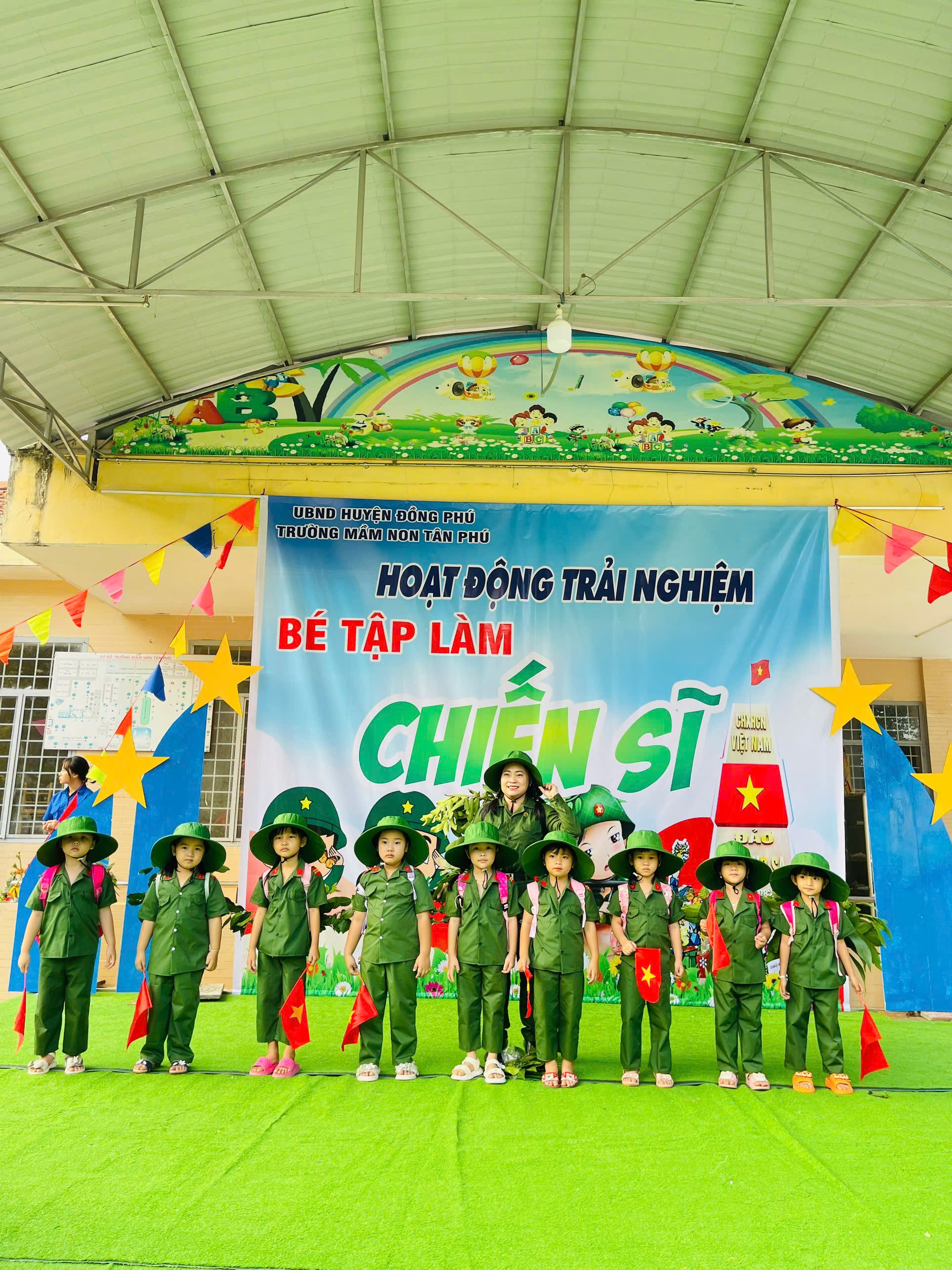 Trong buổi trải nghiệm “ Bé tập làm chiến sỹ”, những “chiến sỹ nhí” của trường Mầm non Tân Phú vai mang súng, đeo ba lô được ngụy trang bằng lá cây háo hức hành quân với các hoạt động thú vị như: Thực tập thao trường với các bài lăn, bò, chui hầm; bò qua hàng rào dây thép gai; duyệt binh; tái hiên hình ảnh của chú bộ đội hành quân, vận chuyển lương thực; tham gia các hoạt động tăng gia sản xuất; các cháu được hướng dẫn thực hành dựng lều, mắc võng; làm cơm nắm, trang trí các món ăn Khoai, mì; Giã muối mè, bóc trứng; Thiết kế xe tăng… Tất cả tạo một bầu không khí sôi nổi, vui tươi. Qua đó giúp các bé hiểu về nhiệm vụ, công việc của lực lượng vũ trang trong cuộc sống thường ngày và trên thao trường. Buổi trải nghiệm đã giúp cho các bé hiểu hơn về truyền thống, tiếp thêm cho các cháu niềm tự hào, trân trọng hình ảnh cao quý “Bộ đội Cụ Hồ”.