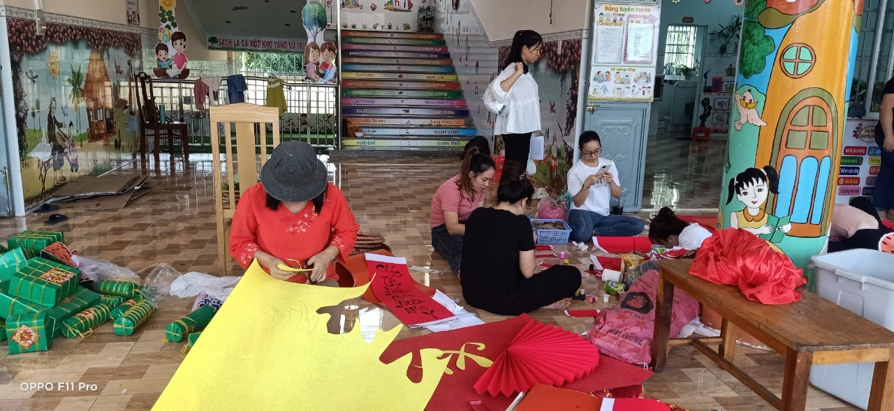 Các cô giáo Trường Mầm non Tân Lập chuẩn bị trang trí Tết.