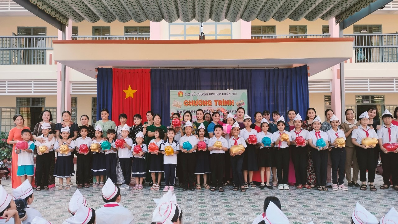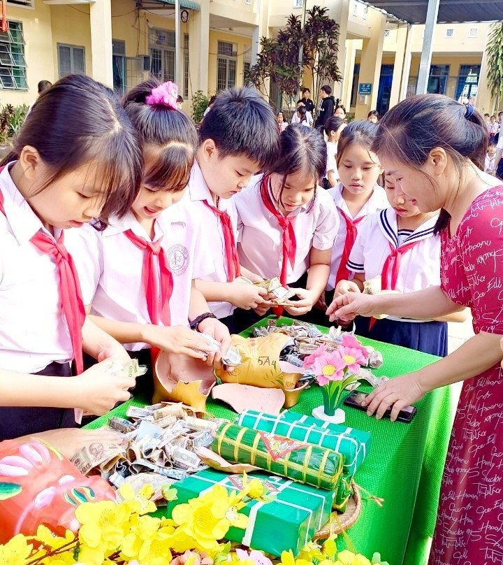 Hoạt động đập heo đất giúp bạn nghèo ăn Tết của Trường Tiểu học Thuận Phú.