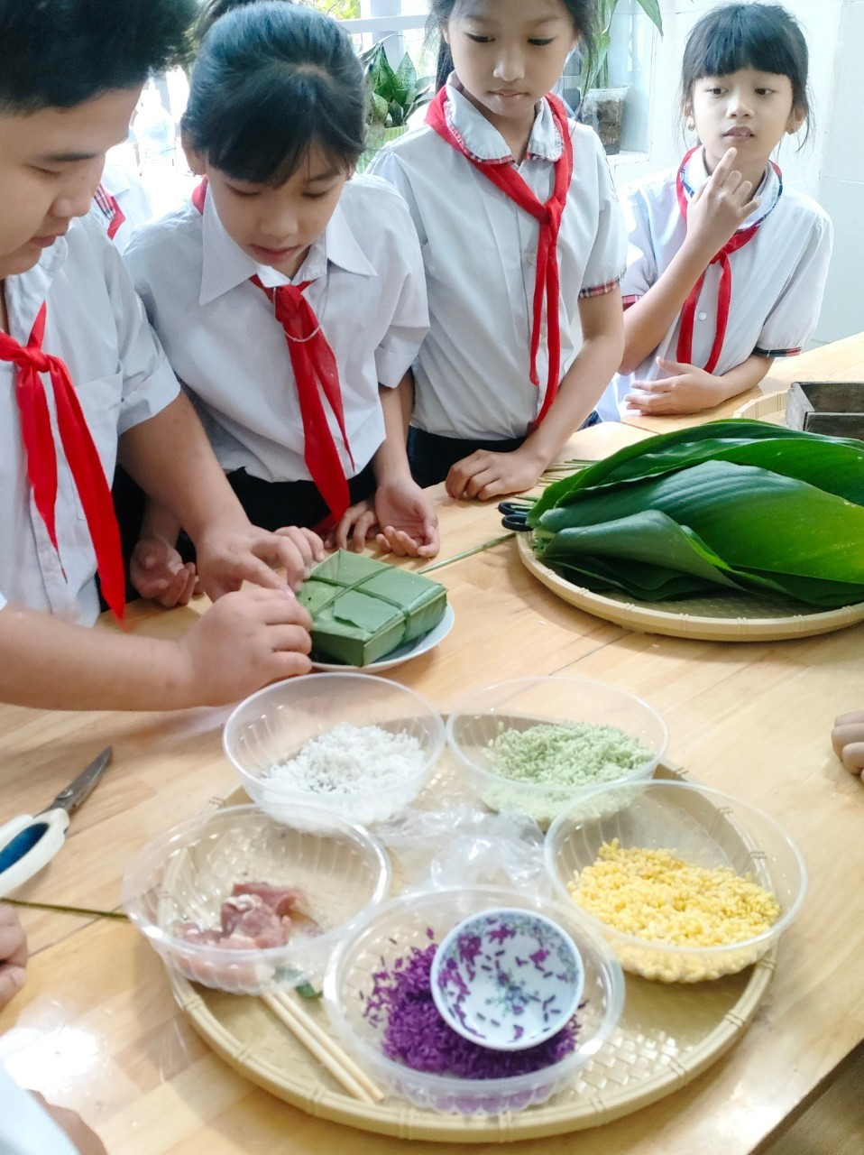 Học sinh lớp 5/1 Trường Tiểu học Tân Lập trải nghiệm gói banh chưng