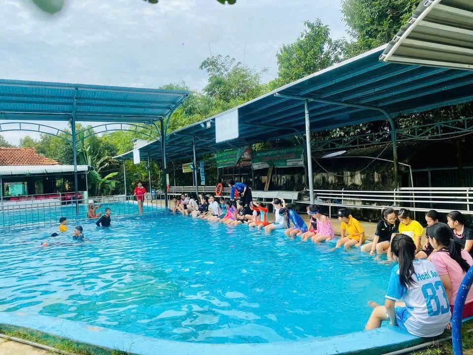 Các em học sinh được hướng dẫn kỹ năng bơi an toàn