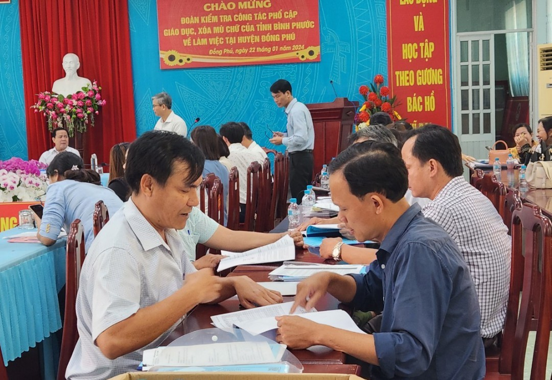 Ngày 22-01-2024, Đoàn Kiểm tra 58 của UBND tỉnh Bình Phước, do ông Trần Văn Thường, Trưởng phòng giáo dục Tiểu học - Mầm non, Sở GD&ĐT tỉnh làm trưởng đoàn đã có buổi làm việc, kiểm tra công tác phổ cập giáo dục, xoá mù chữ (PCGD – XMC) năm 2023 trên địa bàn huyện Đồng Phú. Tiếp đoàn kiểm tra có Phó Chủ tịch UBND huyện Nguyễn Thanh Phương, lãnh đạo Phòng GD&ĐT, thành viên Ban chỉ đạo Phổ cập giáo dục, xóa mù chữ huyện; trưởng Ban chỉ đạo Phổ cập giáo dục, xóa mù chữ các xã thị trấn; hiệu trưởng, phó hiệu trưởng các trường MN, TH, THCS, TH&THCS trên địa bàn huyện.