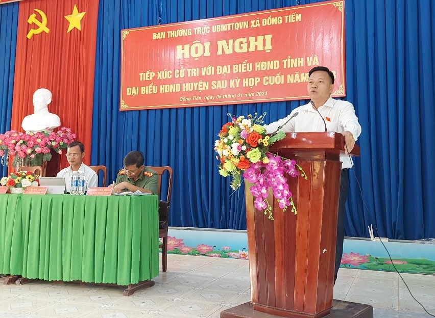 Sau khi nghe tóm tắt tình hình phát triển kinh tế - xã hội của tỉnh, của huyện trong năm 2023 và các ý kiến, kiến nghị của cử tri đã được xem xét, giải quyết tại kỳ tiếp xúc trước, cử tri xã Đồng Tiến tiếp tục có một số kiến nghị về: Tình trạng thiếu thuốc, vật tư y tế trong khám chữa bệnh bảo hiểm y tế; đẩy nhanh tiến độ thi công công trình đường giao thông tại cây số 9; tại một số tuyến đường trên địa bàn xã xe trọng tải lớn thường xuyên qua lại ảnh hưởng đến kết câu đường đề nghị các cấp xem xét để có biện pháp khắc phục; tại đội 9 ấp Cầu 2 có cơ sở chế biến thức ăn nhanh xả thải ra môi trường, gây ô nhiễm môi trường và các hộ dân xung quanh.