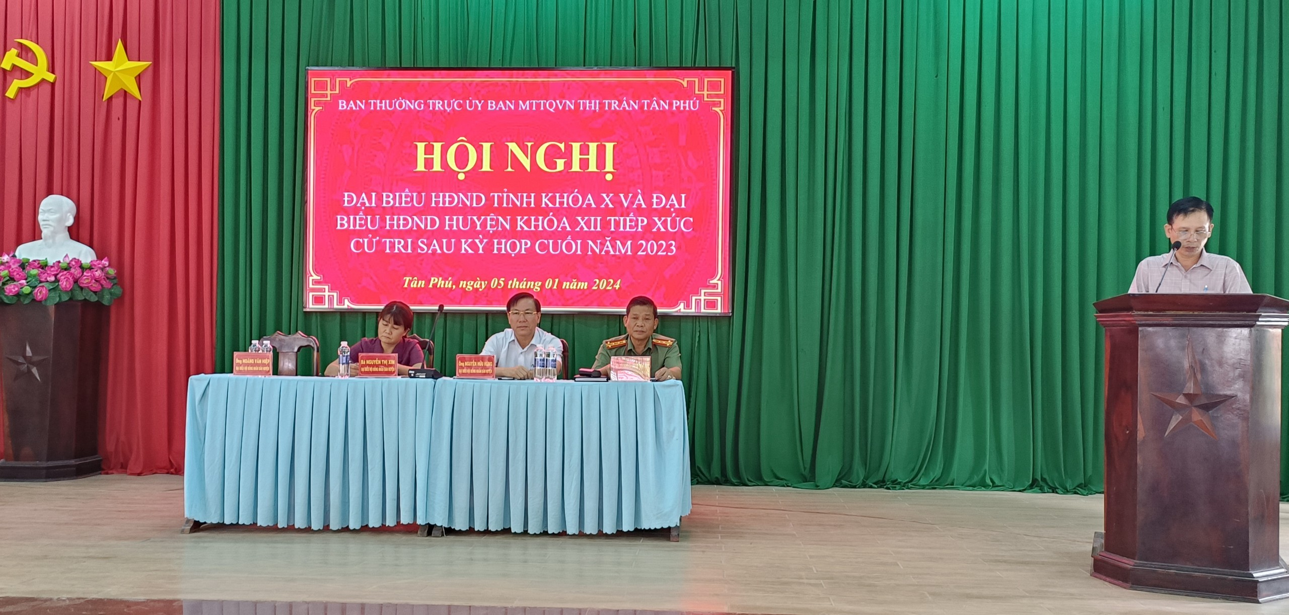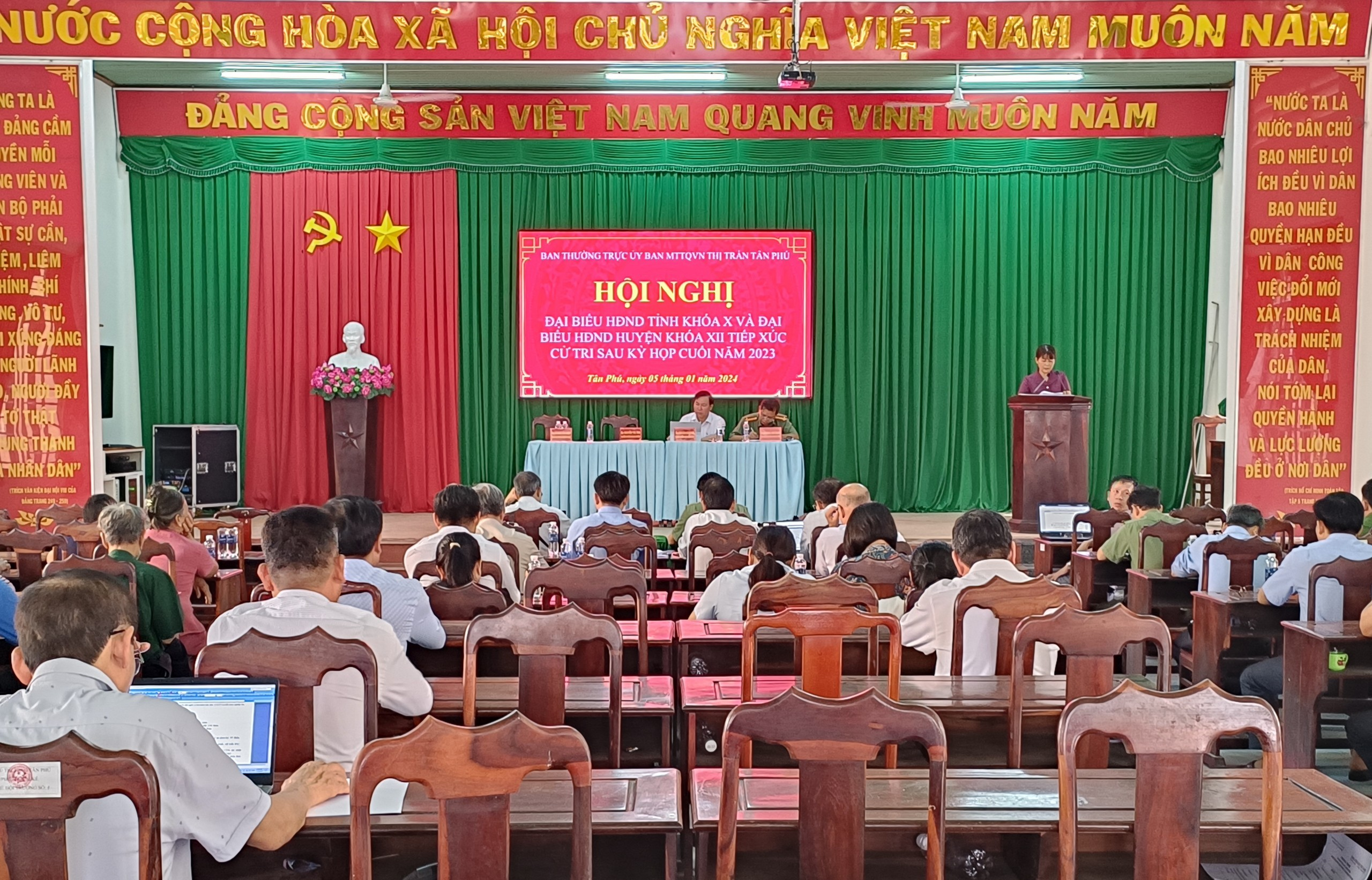 Sau khi đại biểu HĐND tỉnh, huyện thông báo kết quả Kỳ họp thứ 12 HĐND tỉnh; Kỳ họp thứ 9, HĐND huyện và thông báo kết quả lấy phiếu tín nhiệm đối với người giữ chức vụ do HĐND tỉnh, HĐND huyện bầu. Cử tri thị trấn Tân Phú đã tham gia nhiều ý kiến, kiến nghị với các nội dung: Đề nghị các cấp chính quyền hỗ trợ người dân sử dụng dịch vụ công trực tuyến, công tác cấp giấy chứng nhận quyền sử dụng đất chậm, việc thụ lý các vụ án còn kéo dài, tiến độ thi công tuyến đường Phạm Ngọc Thạch, Nguyễn Hữu Thọ chậm ảnh hưởng đến tâm lý người dân, việc thực hiện chế độ chính sách cho người có công còn bất cập; cần trang bị thêm đèn tín hiệu giao thông tại các nút giao với đường ĐT741; hội trường khu phố Tân An quá chật hẹp không đáp ứng nhu cầu sinh hoạt của người dân, đề nghị các cấp chính quyền xác định rõ ranh giới các khu phố, ấp trên địa bàn, ….