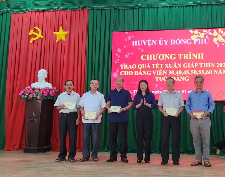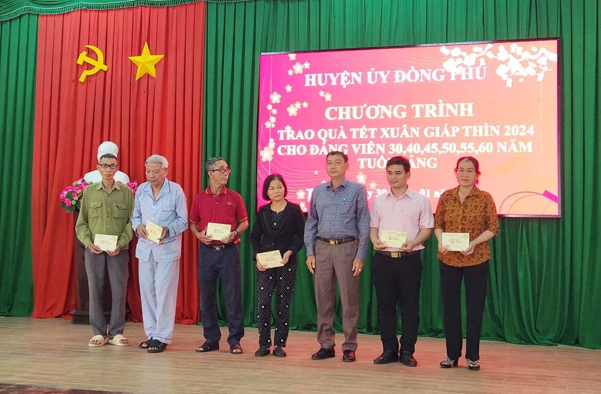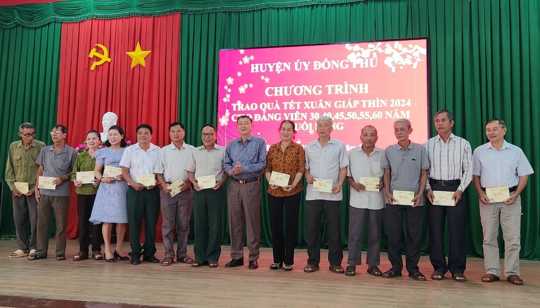 Nhân dịp tết Nguyên đán Giáp Thìn 2024, Huyện ủy, HĐND, UBND, UBMTTQVN huyện Đồng Phú đã tổ chức các đoàn đi thăm tặng quà và chúc mừng các đồng chí là đảng viên cao tuổi đảng .