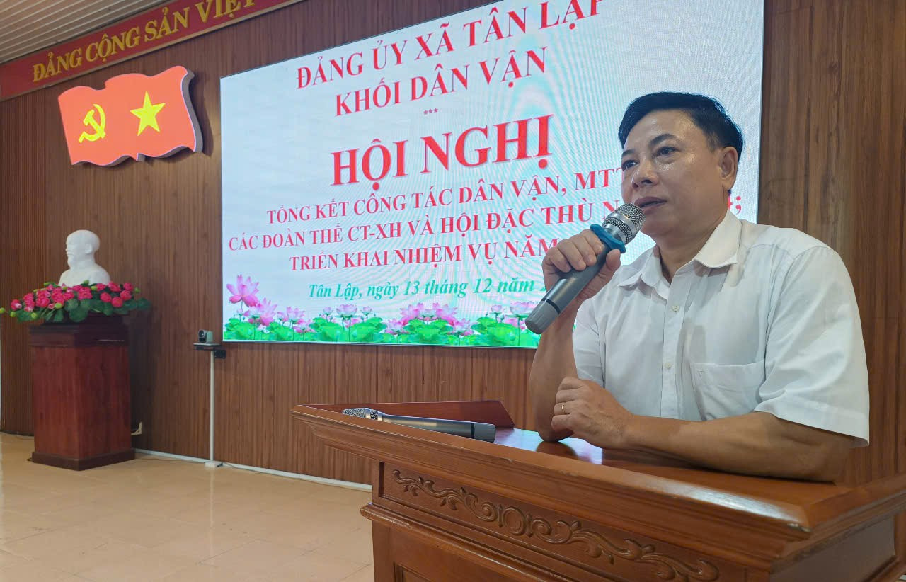 Phát biểu chỉ đạo, UVBTV, Chủ nhiệm UBKT Huyện ủy Hồ Hùng Phi đã đánh giá cao những kết quả xã Tân Lập đã đạt được trong năm 2024. Năm 2025 với nhiều sự kiện chính trị quan trọng, đặc biệt là công tác tổ chức Đại hội Đảng các cấp, tiến tới Đại hội Đảng toàn quốc lần thứ XIV, Khối dân vận xã Tân Lập cần đẩy mạnh công tác tuyên truyền, vận động nhân dân thực hiện tốt chủ trương, đường lối của Đảng, chính sách, pháp luật của Nhà nước, xây dựng khối đại đoàn kết toàn dân, tích cực tham gia các phong trào, cuộc vận động, áp dụng KHKT vào sản xuất, đưa công nghệ thông tin vào công tác hội, đoàn thể, phát huy nội lực, tranh thủ ngoại lực nâng chất các tiêu chí NTM nâng cao, khu dân cư kiểu mẫu,… hoàn thành các chỉ tiêu kinh tế, văn hóa, xã hội, giữ vững an ninh-quốc phòng theo đúng tinh thần Nghị quyết Đại hội Đảng bộ xã, nhiệm kỳ 2020-2025 đã đề ra.