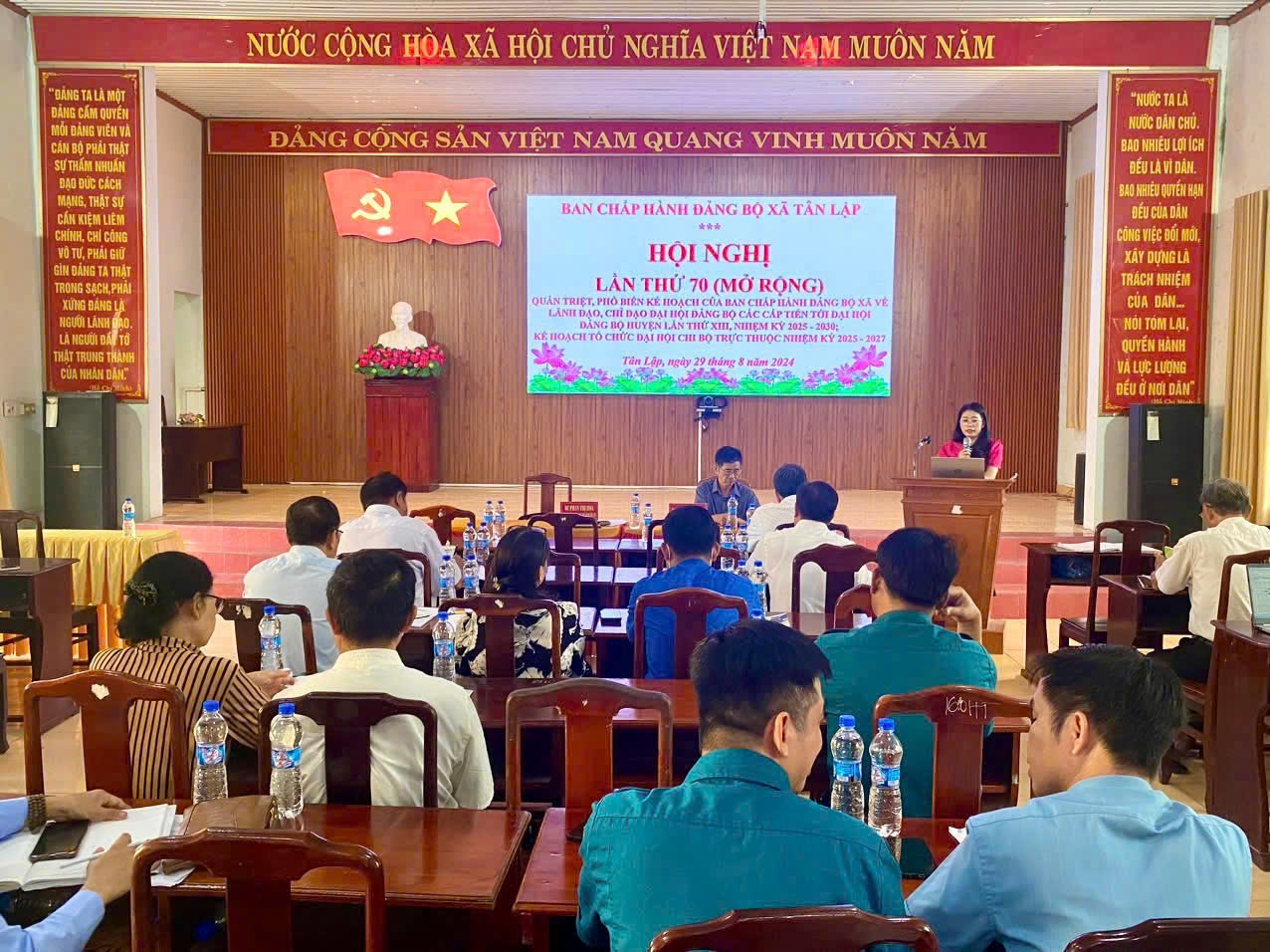 Sáng ngày 29-8-2024, Đảng bộ xã Tân Lập đã tổ chức hội nghị nhằm quán triệt kế hoạch tổ chức Đại hội chi bộ trực thuộc, tiến tới Đại hội Đảng bộ xã nhiệm kỳ 2025 - 2027. HUV, Bí thư Đảng ủy xã Phan Thị Hoa chủ trì hội nghị.