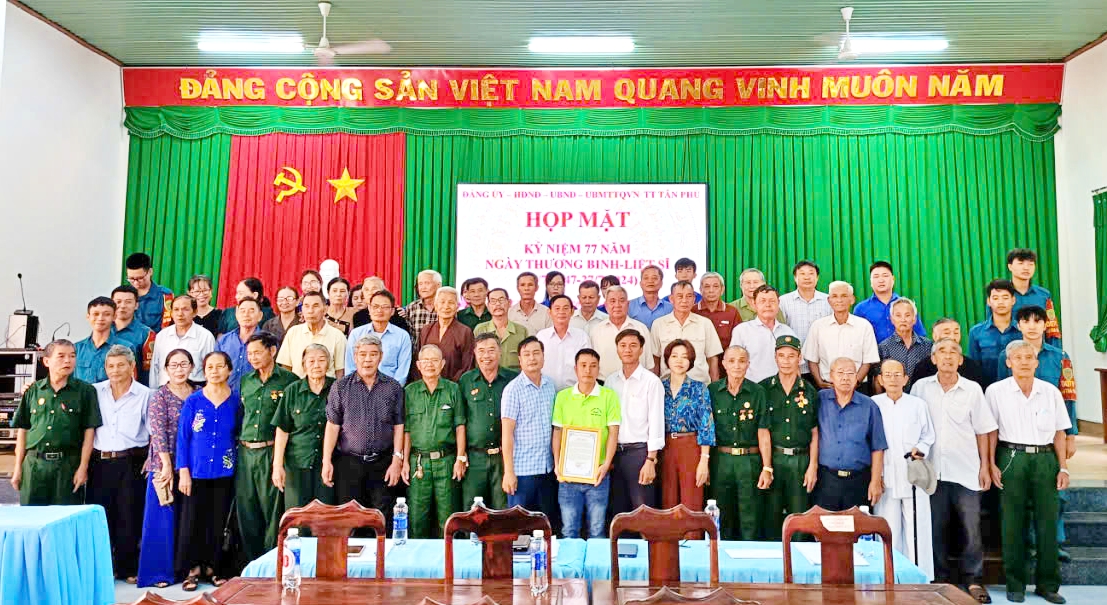 Sáng 26-7, Đảng uỷ, HĐND, UBND, Ủy ban MTQ Việt Nam thị trấn Tân Phú tổ chức kỷ niệm 77 năm Ngày Thương binh - Liệt sĩ (27/7/1947-27/7/2024). Đại diện các ban, ngành, đoàn thể thị trấn, trưởng các khu phố, ấp, các thương binh, bệnh binh và thân nhân gia đình liệt sĩ, người có công với cách mạng trên địa bàn đã về dự.