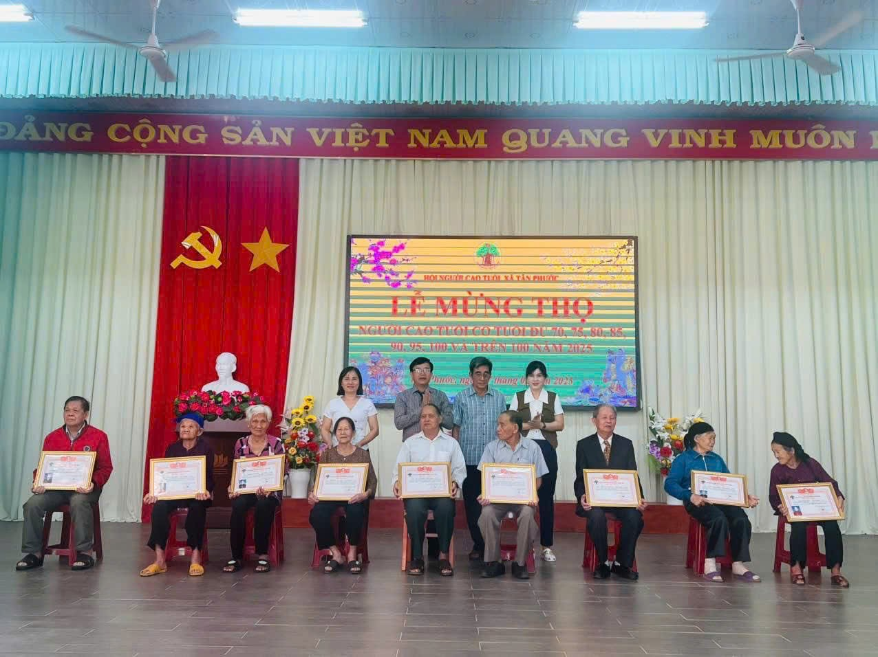 Năm 2025, xã Tân Phước có 55 người cao tuổi được mừng thọ, trong đó có 01 cụ trên 100 tuổi; 02 cụ tròn 90 tuổi; 01 cụ 85 tuổi; 15 cụ tròn 80 tuổi; 23 cụ 75 tuổi và 13 cụ tròn 70 tuổi.. Lễ mừng thọ năm nay được Đảng ủy – HĐND – UBND – UBMTTQ xã tổ chức không khí ấm áp, vui tươi thể hiện được tinh thần "kính lão trọng thọ" tốt đẹp của người Việt Nam.