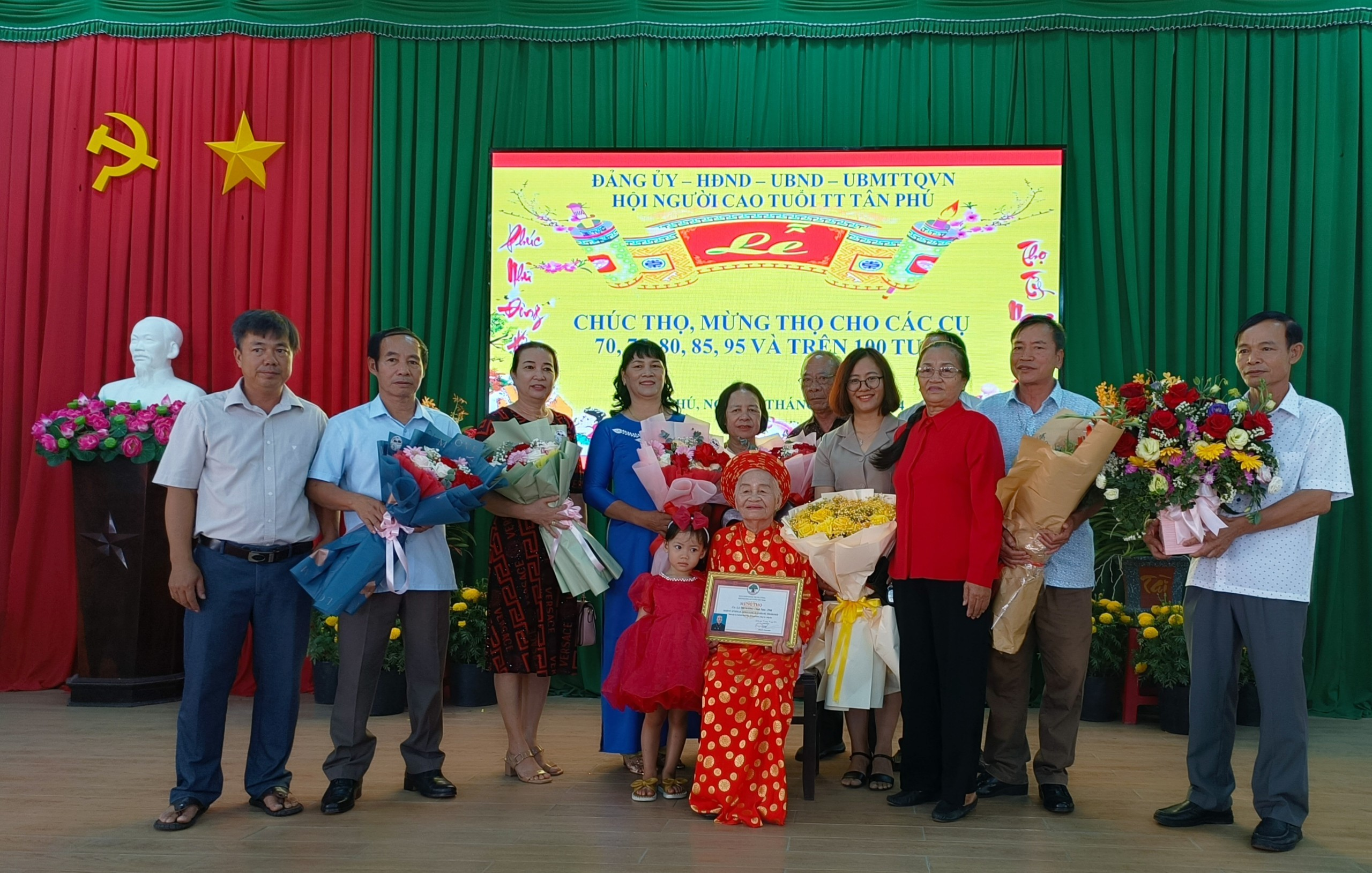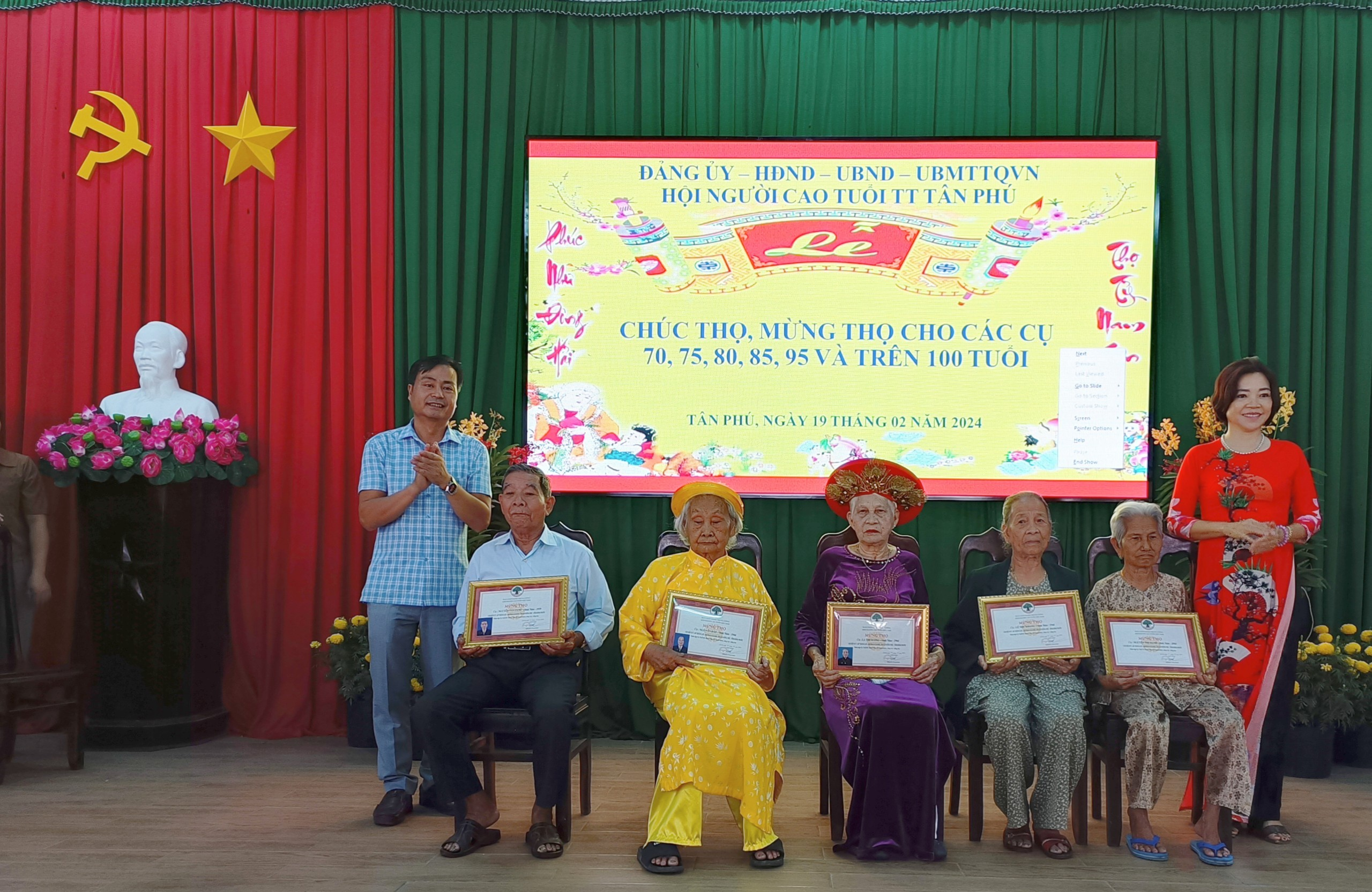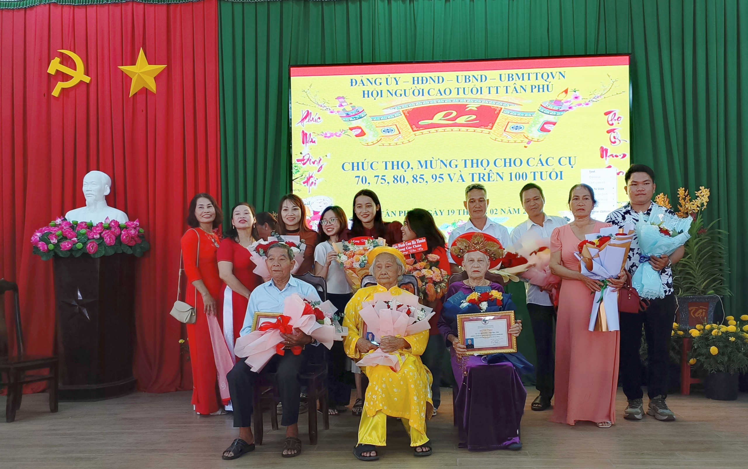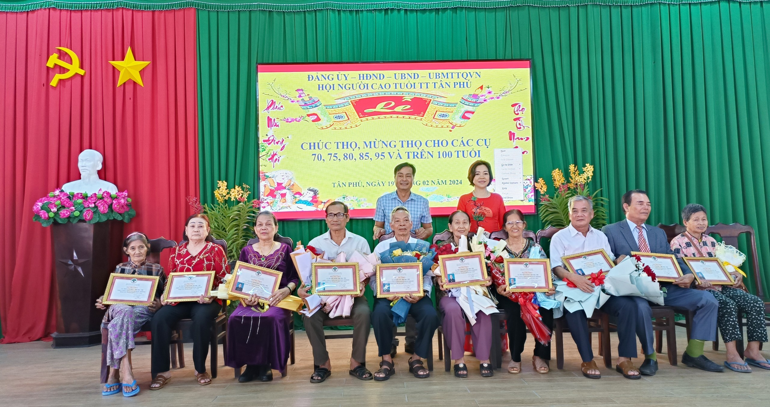 Tại thị trấn Tân Phú, sáng 19-2-2024, Đảng ủy, HĐND, UBND, UBMTTQVN thị trấn đã long trọng tổ chức Lễ Mừng thọ, chúc thọ cho 86 cụ cao niên, trong đó có 34 cụ 70 tuổi, 22 cụ 75 tuổi, 17 cụ 80 tuổi, 10 cụ 85 tuổi, 2 cụ 95 tuổi và 1 cụ 102 tuổi.