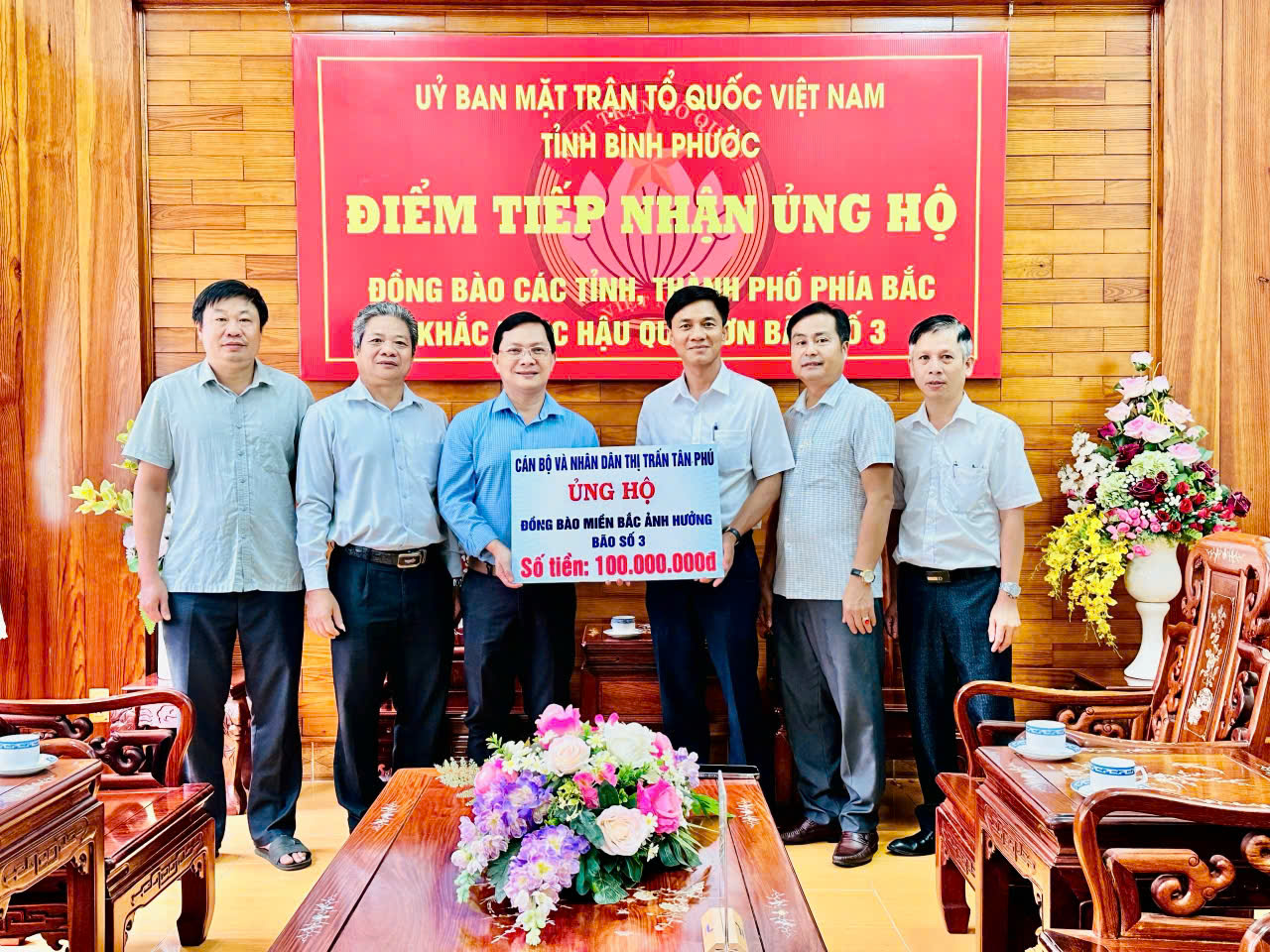 Ngày 27-9, lãnh đạo thị trấn Tân Phú đã trực tiếp đến Ủy ban MTTQ Việt Nam tỉnh Bình Phước trao số tiền vận động đợt 2 ủng hộ đồng bào các tỉnh, thành phố phía Bắc bị thiên tai, bão lũ.