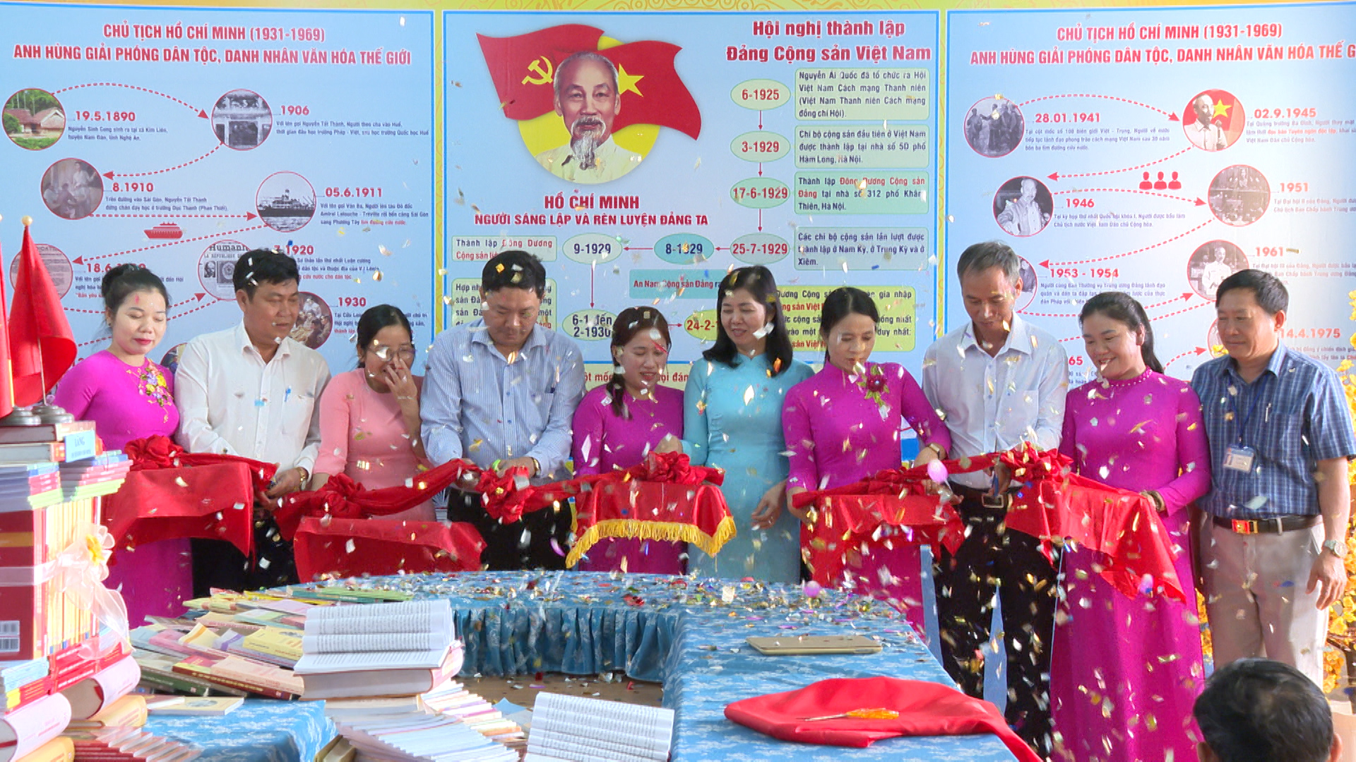 Các đồng chí lãnh đạo cắt băng khánh thành công trình Không gian văn hoá đọc - Không gian văn hoá Hồ Chí Minh tại Phòng họp Ban Chấp hành Đảng ủy