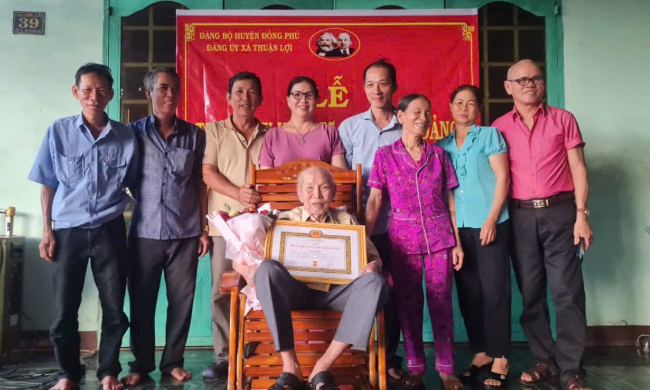 Lãnh đạo huyện và xã tại buổi lễ trao huy hiệu 75 năm tuổi Đảng cho đảng viên Hà Cao Khải