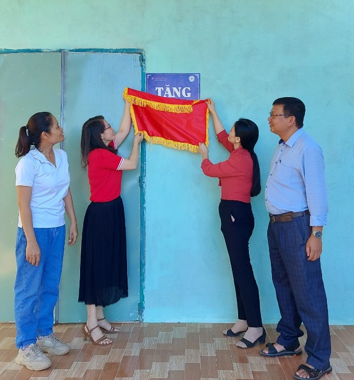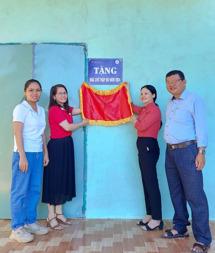 Lãnh đạo Hội chữ thập đỏ huyện và xã Đồng Tiến tháo băng biểu trưng tặng nhà
