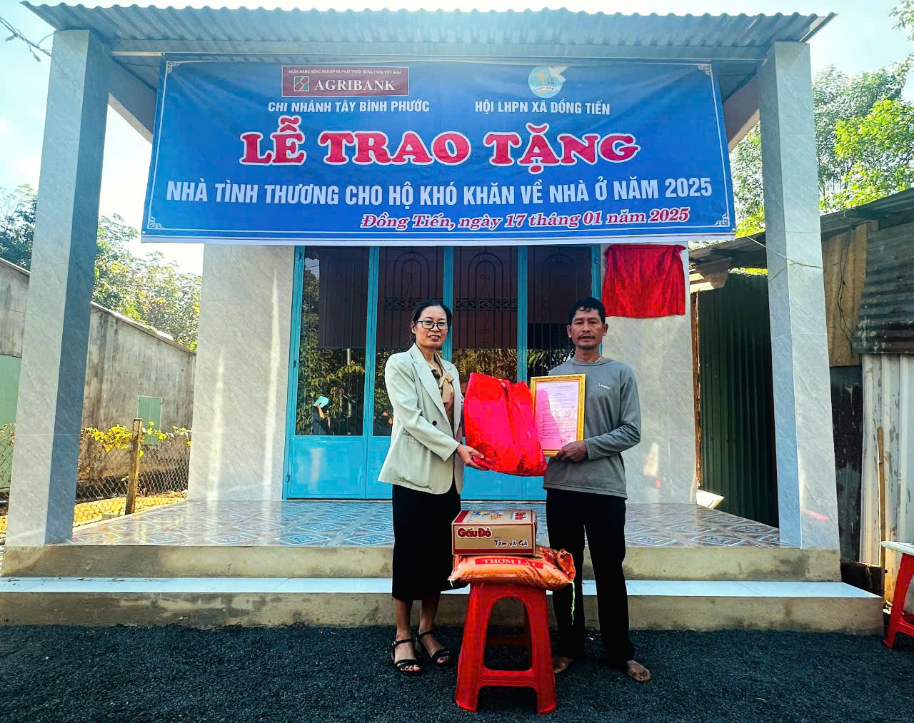 Ngày 17/01/2025, Hội LHPN xã Đồng Tiến phối hợp với Ngân hàng Nông nghiệp Chi nhánh Tây Bình Phước tổ chức lễ Trao tặng mái ấm tình thương cho hộ bà Điểu Thị Khoanh, ông Điểu Son tại ấp 5, xã Đồng Tiến, là hội viên phụ nữ có hoàn cảnh khó khăn về nhà ở.