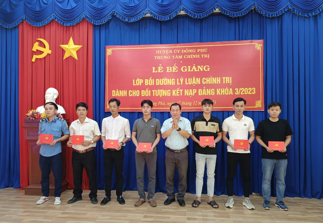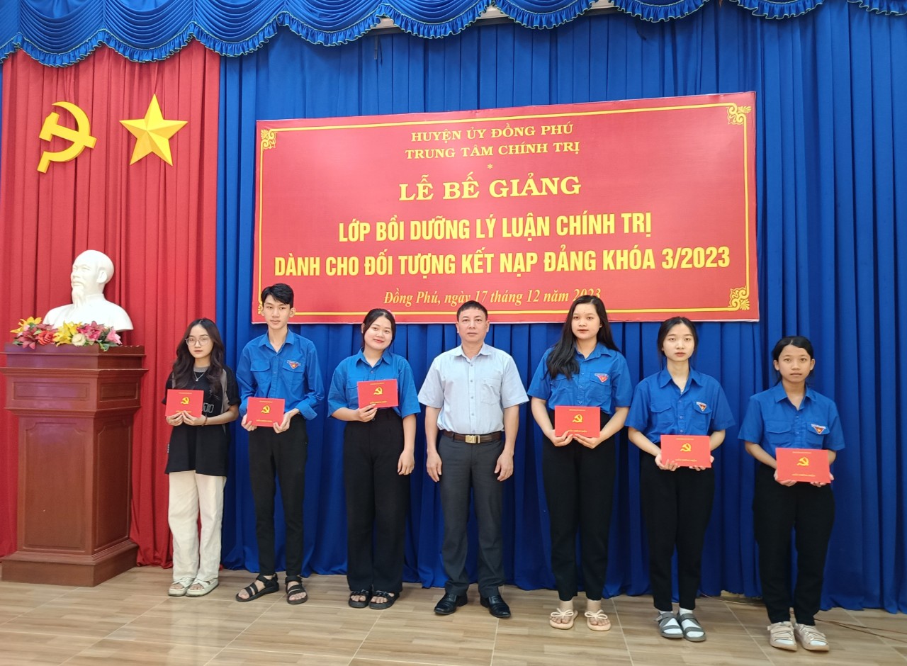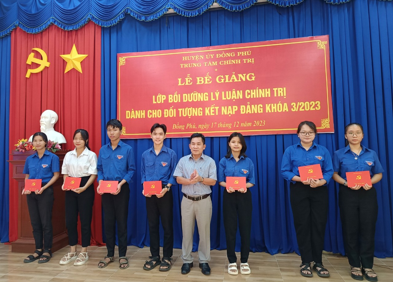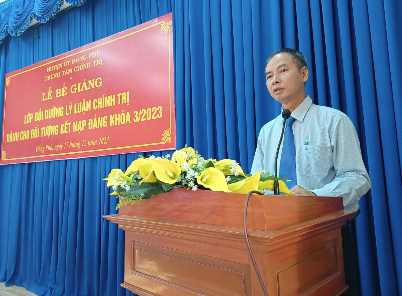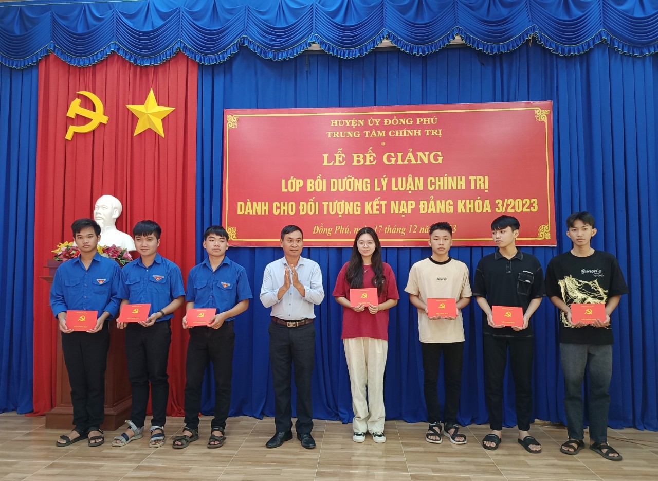 Sáng ngày 17-12, Trung tâm Chính trị huyện phối hợp với các cơ quan, đơn vị liên quan tổ chức Lễ bế giảng lớp bồi dưỡng lý luận chính trị dành cho đối tượng kết nạp đảng khóa 03/2023. Dự lễ có Ủy viên Ban thường vụ, Trưởng Ban tuyên giáo Huyện ủy, Giám đốc Trung tâm chính trị huyện Nguyễn Văn Tặng; ủy viên Ban thường vụ, Chủ nhiệm Ủy ban kiểm tra Huyện ủy Hồ Hùng Phi cùng lãnh đạo một số cơ quan, ban, ngành, đoàn thể huyện, Đảng ủy xã Tân Tiến, Đảng bộ Trường THPT Đồng Phú và Trường THCS và THPT Đồng Tiến.
