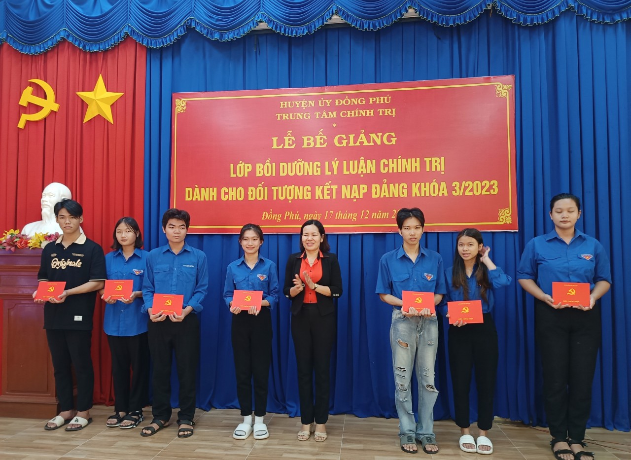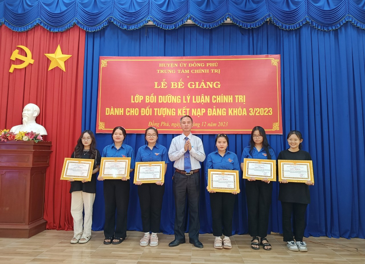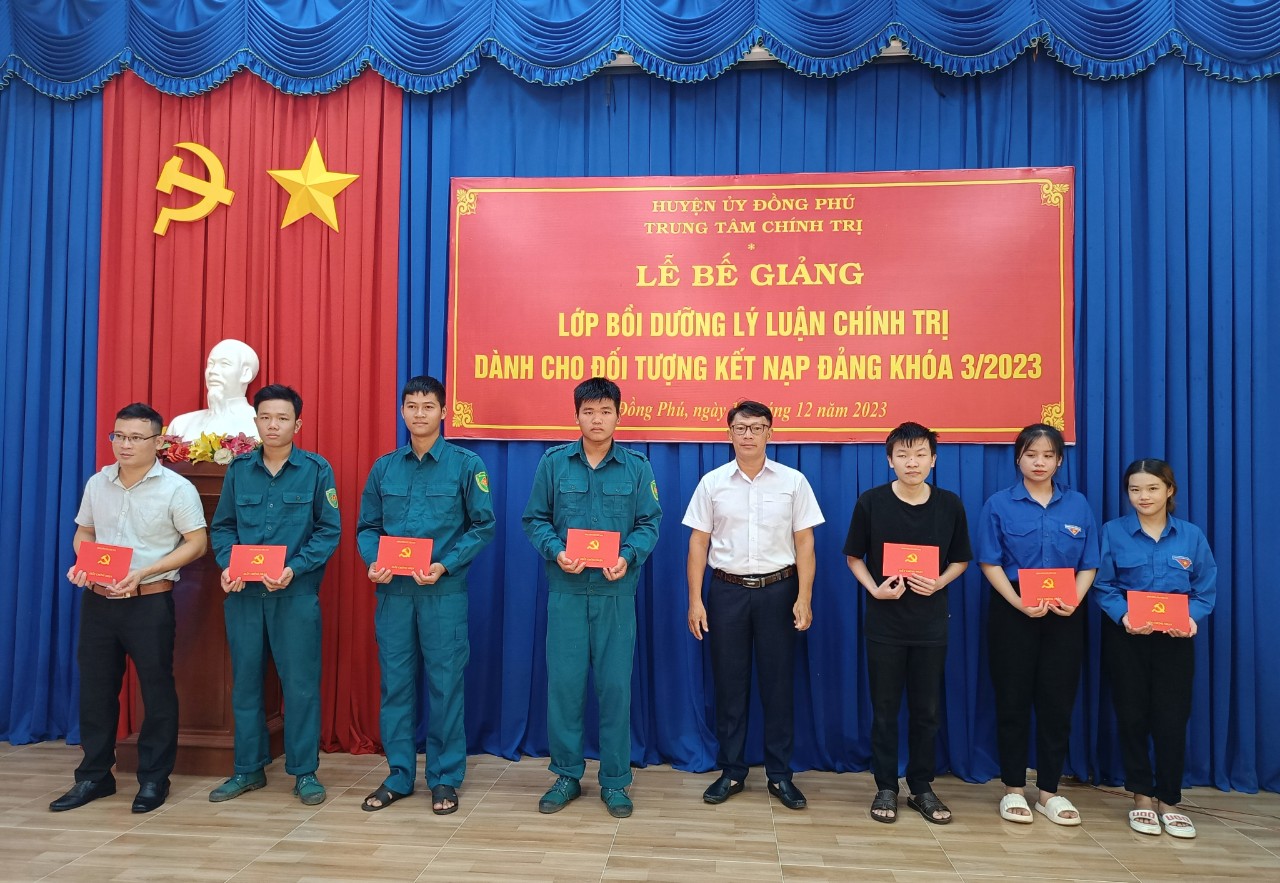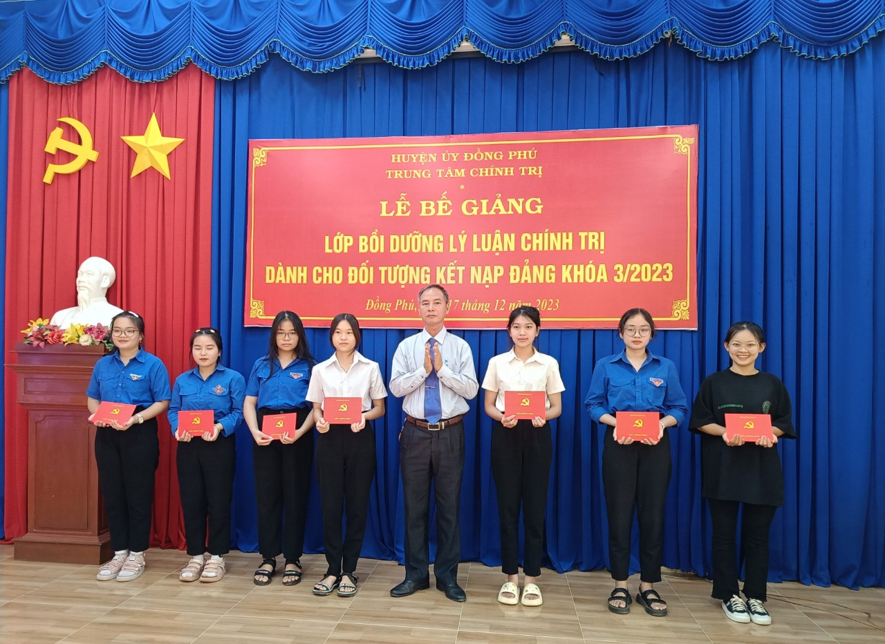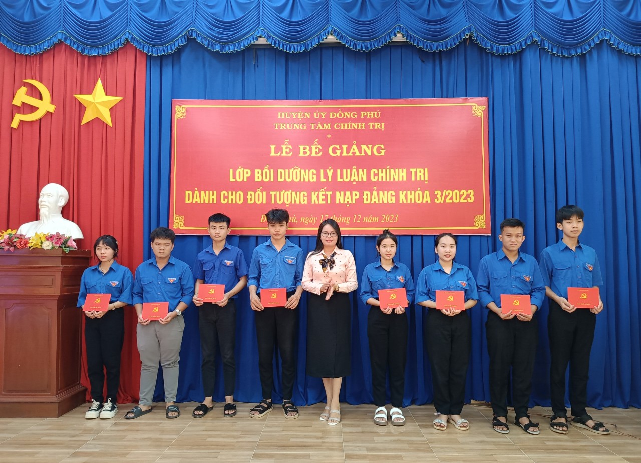 Sáng ngày 17-12, Trung tâm Chính trị huyện phối hợp với các cơ quan, đơn vị liên quan tổ chức Lễ bế giảng lớp bồi dưỡng lý luận chính trị dành cho đối tượng kết nạp đảng khóa 03/2023. Dự lễ có Ủy viên Ban thường vụ, Trưởng Ban tuyên giáo Huyện ủy, Giám đốc Trung tâm chính trị huyện Nguyễn Văn Tặng; ủy viên Ban thường vụ, Chủ nhiệm Ủy ban kiểm tra Huyện ủy Hồ Hùng Phi cùng lãnh đạo một số cơ quan, ban, ngành, đoàn thể huyện, Đảng ủy xã Tân Tiến, Đảng bộ Trường THPT Đồng Phú và Trường THCS và THPT Đồng Tiến.