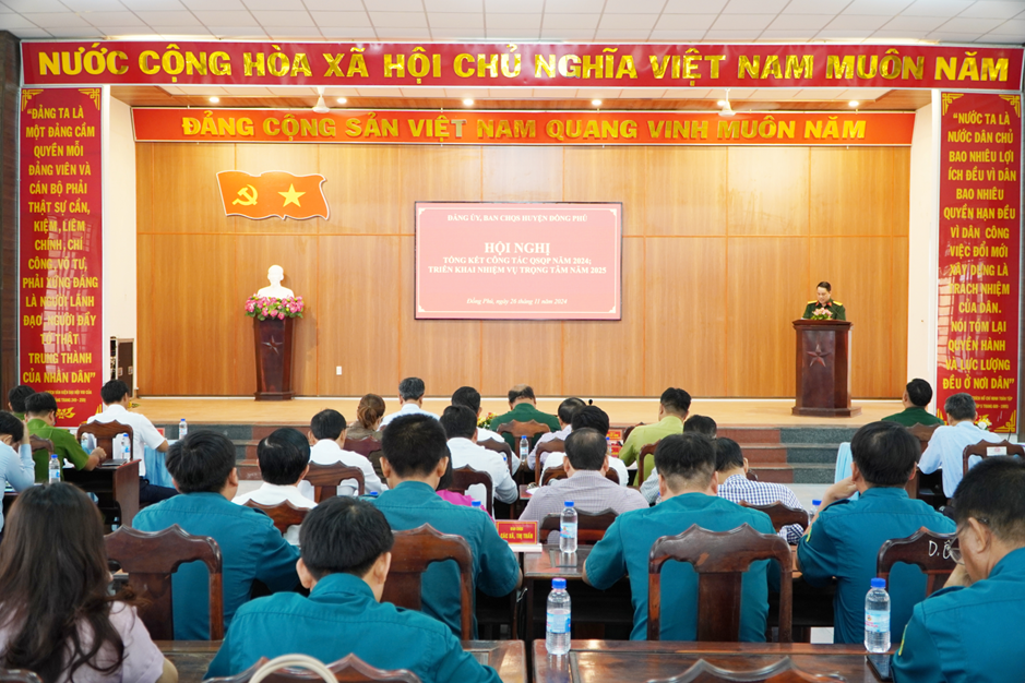 Sáng 26-11, Ban CHQS huyện Đồng Phú tổ chức hội nghị tổng kết công tác quân sự, quốc phòng năm 2024, triển khai nhiệm vụ năm 2025. Phó bí thư Huyện uỷ, chủ tịch UBND huyện Lê Văn Trân dự chỉ đạo hội nghị.