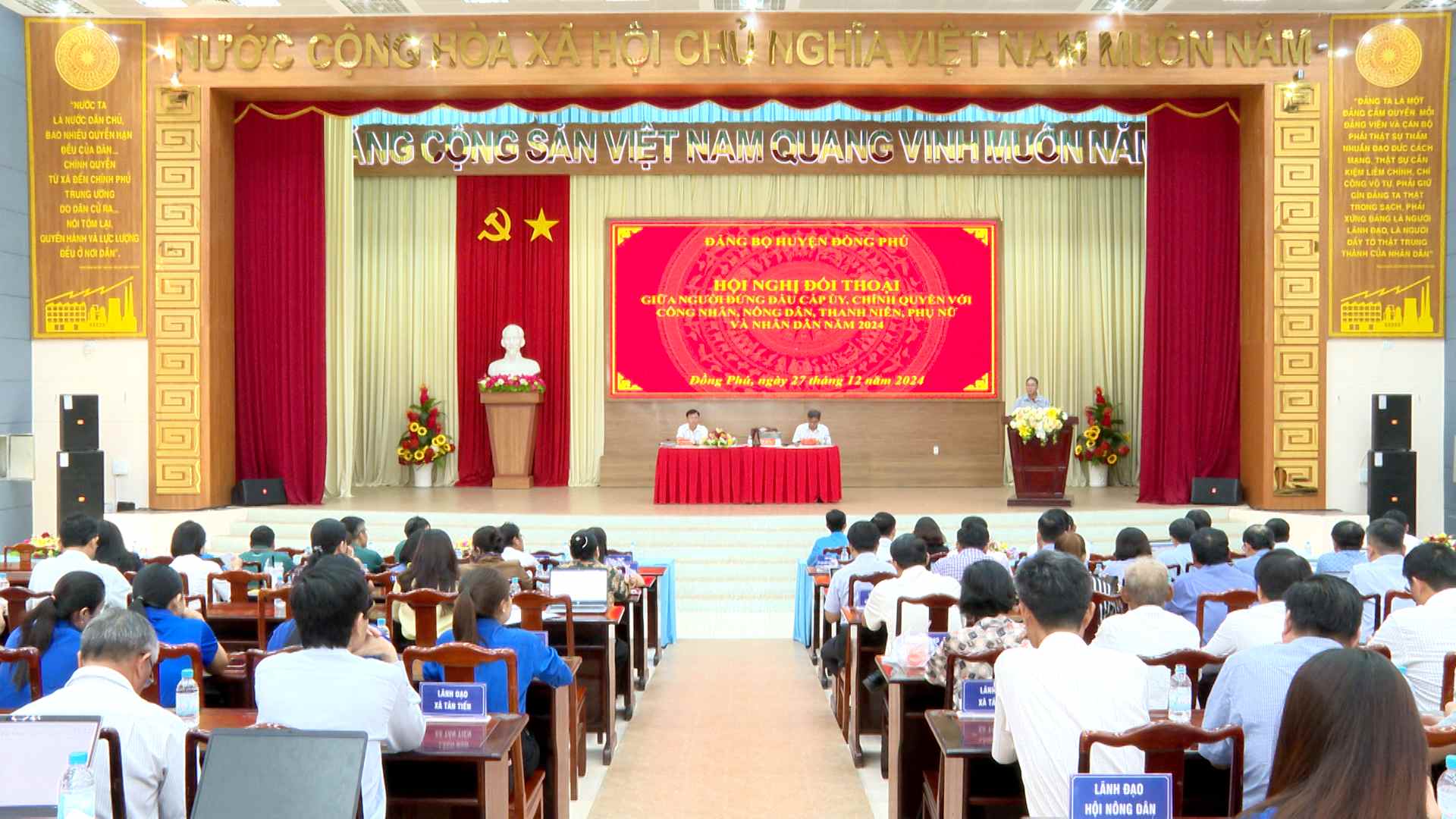 Chiều 27-12, huyện Đồng Phú tổ chức hội nghị đối thoại giữa người đứng đầu cấp uỷ, chính quyền với công nhân, nông dân, thanh niên, phụ nữ và Nhân dân trên địa bàn huyện năm 2024. Thường trực Huyện uỷ, UBND, Uỷ ban MTTQ Việt Nam huyện chủ trì hội nghị.