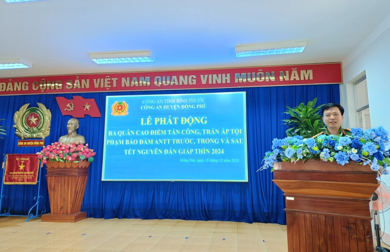 Phát biểu tại lễ ra quân, Thượng tá Nguyễn Đức Minh, Trưởng Công an huyện Đồng Phú nhấn mạnh, trong năm 2023, tình hình hình an ninh chính trị, an ninh trật tự, trật tự an toàn xã hội trên địa bàn huyện đảm bảo ổn định, lực lượng công an đã kịp thời nắm bắt, xử lý nhanh, không để phát sinh vụ việc nổi cộm, phức tạp. Qua đó công an huyện được Công an tỉnh đánh giá là đơn vị xuất sắc và được đề nghị Bộ công an tặng cờ thi đua. Vì vậy, Trưởng công an huyện đề nghị các đội nghiệp vụ, Đồn công an khu công nghiệp Bắc Đồng Phú, công an các xã, thị trấn và toàn thể lực lượng cần phát huy thành tích đạt được, nâng cao tinh thần trách nhiệm, chủ động nắm chắc tình hình, tập trung tham mưu, chỉ đạo giải quyết tốt các vấn đề nổi cộm, không để hình thành “điểm nóng” về an ninh trật tự. Đồng thời tăng cường tuần tra, kiểm soát trấn áp tội phạm, vì sự bình yên của nhân dân.