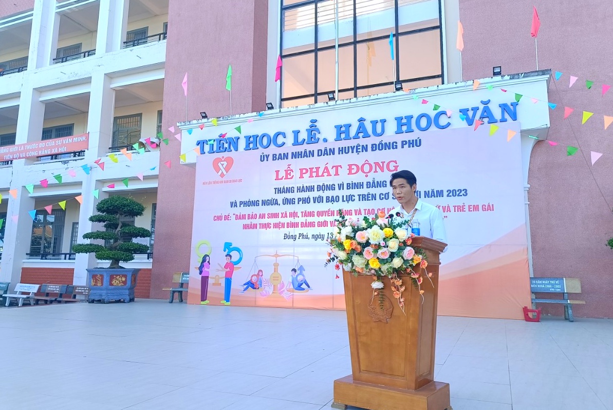 Phát biểu tại lễ phát động, Ủy viên Ban thường vụ Huyện ủy, phó chủ tịch UBND huyện Nguyễn Thanh Phương nhấn mạnh: những năm qua, huyện Đồng Phú luôn quan tâm và thực hiện tốt công tác bình đẳng giới, nhất là việc giảm dần khoảng cách giới trong lĩnh vực chính trị. Hiện nay, tỷ lệ nữ lãnh đạo chủ chốt tại UBND cấp xã chiếm 12%; tỷ lệ nữ quy hoạch các vị trí lãnh đạo chủ chốt cấp xã nhiệm kỳ 2020-2025 đạt 31,6%. Đặc biệt tại các cơ quan Đảng, tổ chức chính trị - xã hội, tỷ lệ nữ giữ chức vụ chủ chốt chiếm 43%. Các chính sách liên quan đến chăm sóc sức khỏe, giáo dục và an sinh xã hội được thực hiện hiệu quả. 100% phụ nữ mang thai được tiêm chủng, thăm khám định kỳ, tư vấn xét nghiệm dự phòng lây truyền HIV; 100% bà mẹ sinh con tại các cơ sở y tế.