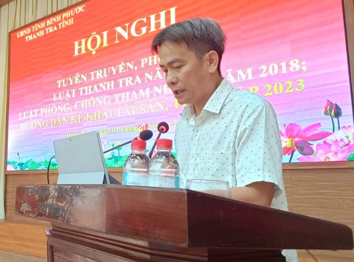 Tiếp đó, đại biểu dự hội nghị được Chánh Thanh tra tỉnh Bình Phước Phạm Văn Thuấn phổ biến những nội dung quan trọng, điểm mới của Luật Thanh tra năm 2022, có hiệu lực thi hành kể từ ngày 01/7/2023; Luật Phòng chống tham nhũng năm 2018; Nghị định số 130/2020/NĐ-CP ngày 20/10/2020 của Chính phủ quy định về kiểm soát tài sản, thu nhập của người có chức vụ, quyền hạn trong cơ quan, tổ chức, đơn vị và các văn bản hướng dẫn thi hành. Ngoài ra, các đại biểu còn được đề cập đến các nội dung về trách nhiệm của các cơ quan, đơn vị, UBND cấp xã; cán bộ, công chức, viên chức trong vấn đề kê khai tài sản và trong kiểm soát tài sản, thu nhập.