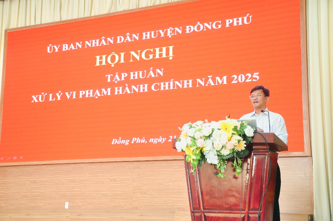 Sáng 21-3, UBND huyện Đồng Phú tổ chức hội nghị tập huấn xử lý vi phạm hành chính năm 2025 cho lãnh đạo, công chức trực tiếp tham mưu lĩnh vực xử lý vi phạm hành chính và theo dõi thi hành pháp luật của các cơ quan, đơn vị cấp huyện; chủ tịch, phó chủ tịch được giao thẩm quyền xử lý vi phạm hành chính, trưởng công an, công chức trực tiếp tham mưu, tổng hợp công tác xử lý vi phạm hành chính các xã, thị trấn trên địa bàn.