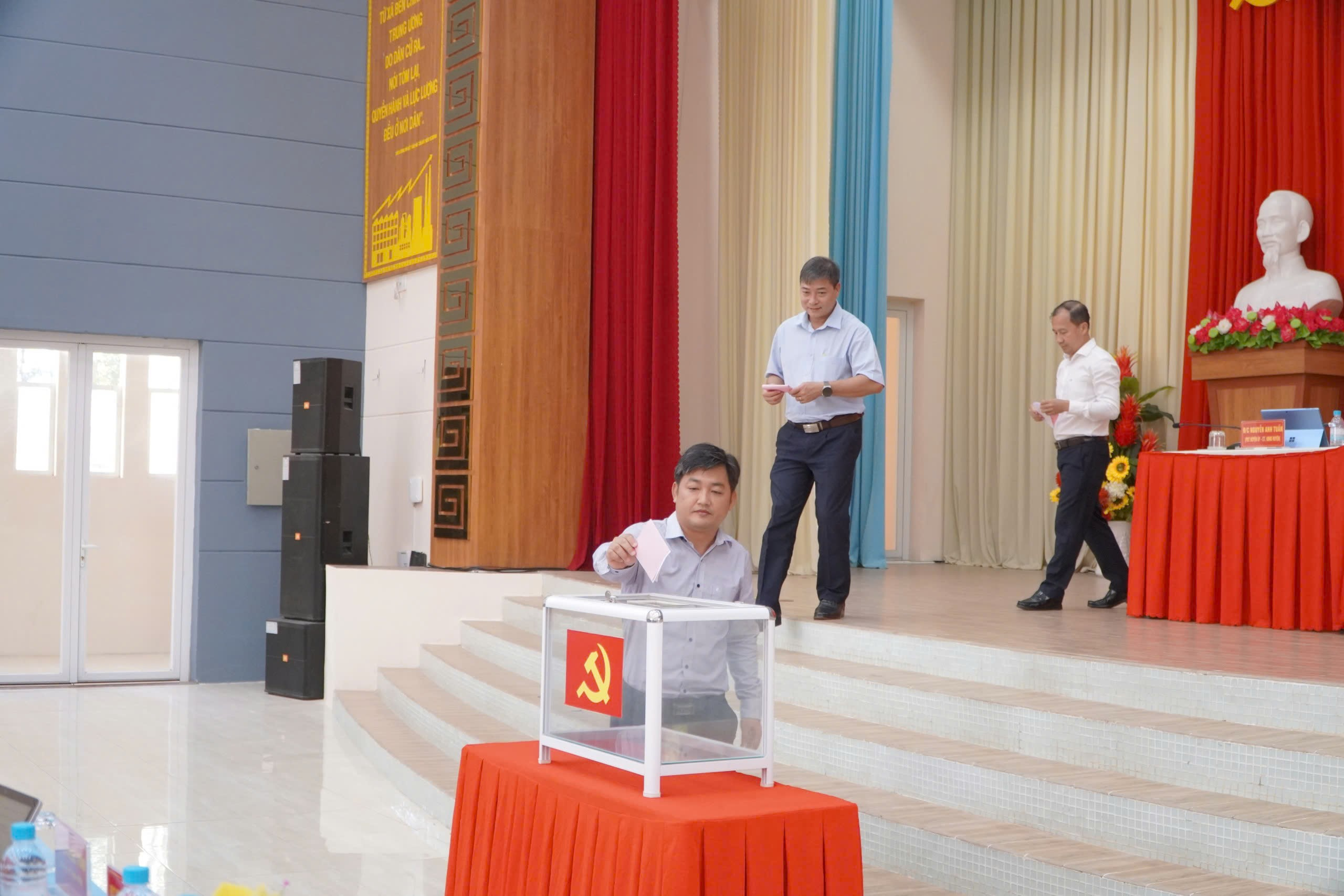 Trên cơ sở quy hoạch, xét tiêu chuẩn, điều kiện, khả năng cán bộ và yêu cầu thực tiễn về xây dựng đội ngũ cán bộ lãnh đạo chủ chốt của huyện, hội nghị đã tiến hành thực hiện quy trình bổ sung 01 ủy viên BTV Huyện ủy (cơ cấu Trưởng Ban Tuyên giáo Huyện ủy) đối với ông Nguyễn Đức Việt Tựu- HUV, Phó trưởng ban tuyên giáo; 02 ủy viên UBKT Huyện ủy kiêm chức đối với ông Trương Hữu Thành- HUV, Phó trưởng Ban tổ chức huyện ủy và ông Nguyễn Văn Đốc- Chánh thanh tra huyện, với số phiếu tín nhiệm cao.