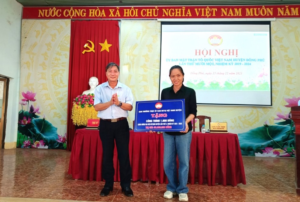 Ban Thường trực Ủy ban MTTQ Việt Nam huyện và các tổ chức thành viên vận động, xây dựng, bàn giao 17 căn nhà Đại đoàn kết, nhà tình thương, nhà chữ thập đỏ với số tiền trên 1,3 tỷ đồng; MTTQ các xã, thị trấn phối hợp chăm lo cho 496 lượt người nghèo với số tiền gần 250 triệu đồng. Ngoài ra, nhân các dịp lễ, tết cổ truyền dân tộc, tết của đồng bào dân tộc, tôn giáo, MTTQ từ huyện xuống cơ sở đã phối hợp với chính quyền, các tổ chức thành viên vận động, tiếp nhận và tặng hàng ngàn phần quà trị giá hơn 4,5 tỷ đồng cho hộ nghèo, cận nghèo, người có hoàn cảnh khó khăn, đối tượng Bảo trợ xã hội...