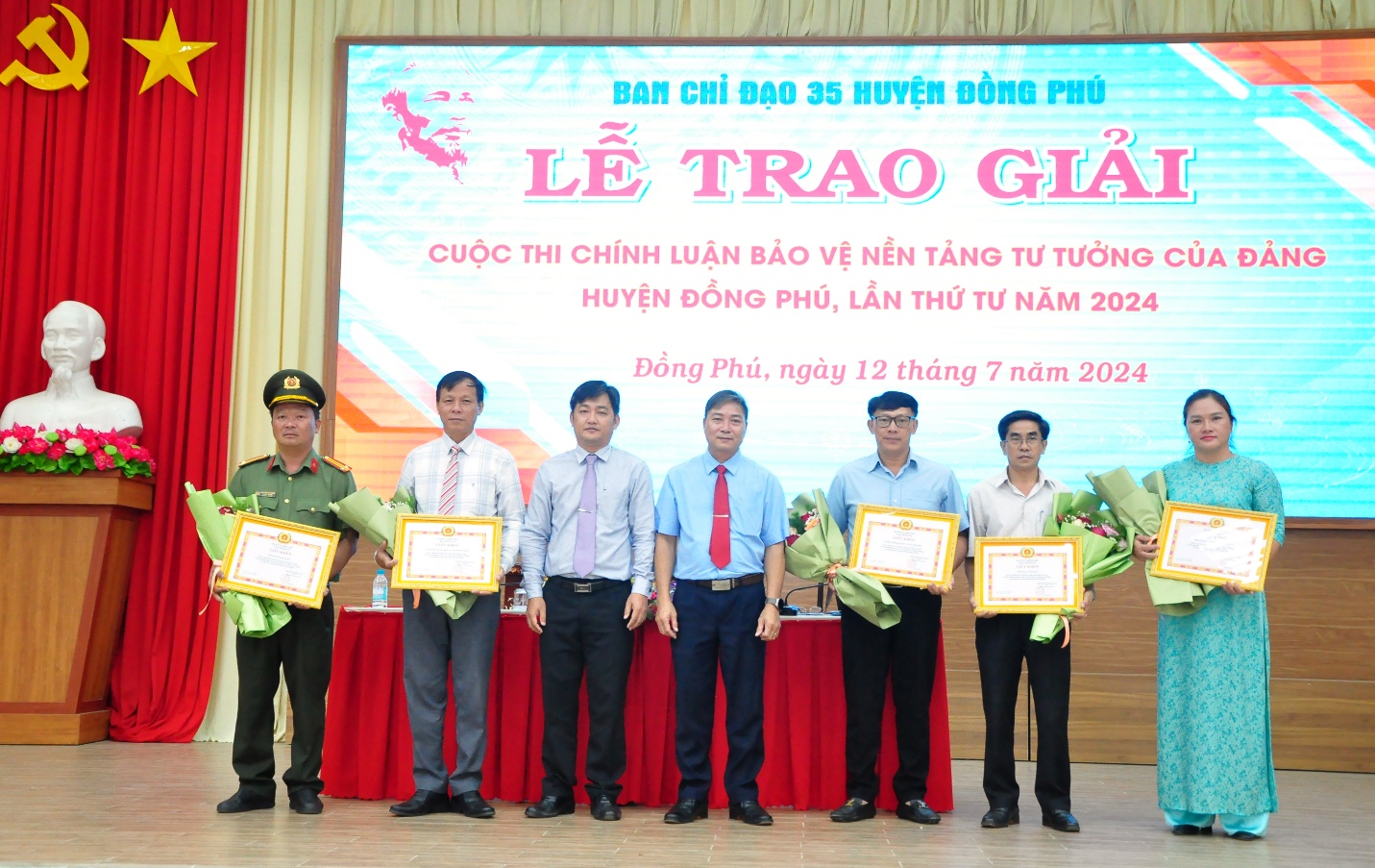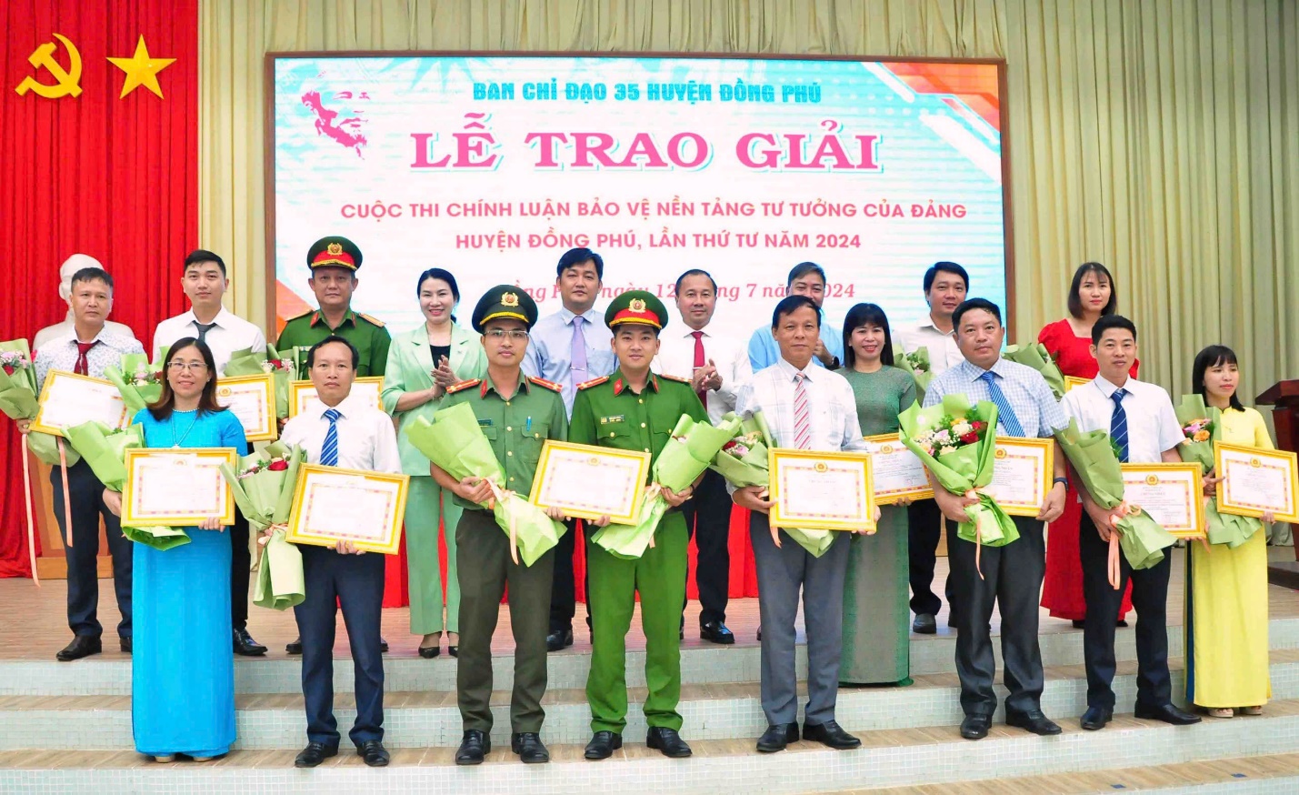 Chiều 12-7, Huyện ủy Đồng Phú tổ chức lễ tổng kết trao giải cuộc thi chính luận về bảo vệ nền tảng tư tưởng của Đảng năm 2024. Thường trực Huyện ủy, HĐND, UBND, UBMTTQVN huyện; lãnh đạo Các chi, Đảng bộ trực thuộc Huyện ủy và các tập thể, cá nhân đạt thành tích cao của cuộc thi tham dự buổi lễ.