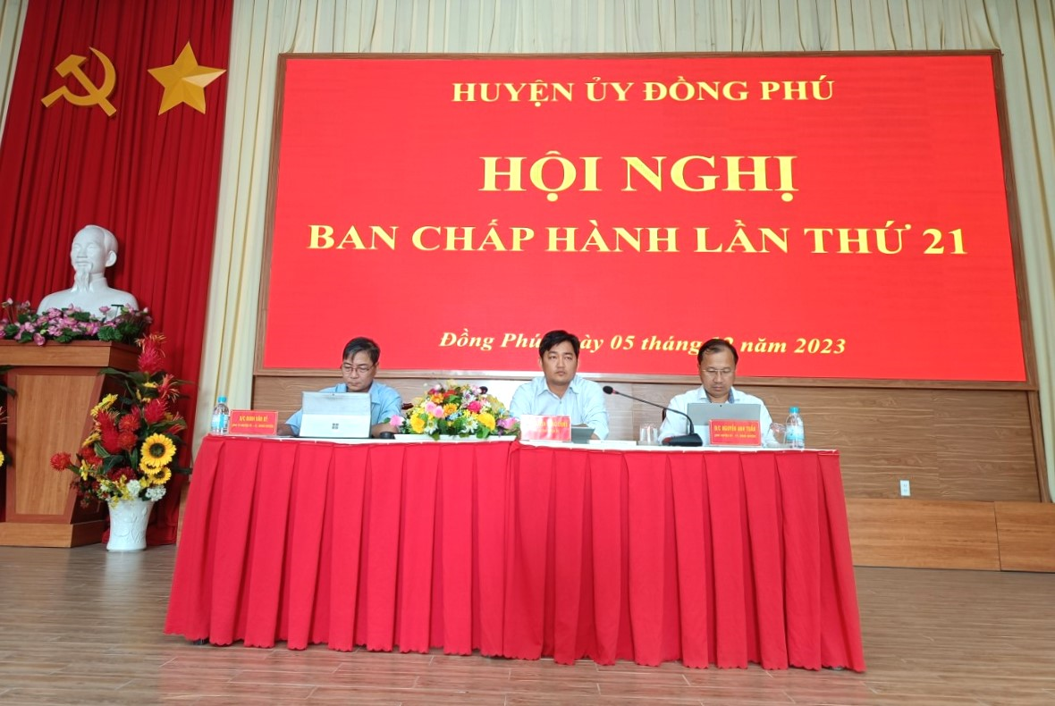 Cũng tại hội nghị, Ban chấp hành đảng bộ huyện đã xem xét và thông qua báo cáo tình hình thu, chi ngân sách năm 2023, dự toán thu, chi ngân sách năm 2024 và các tờ trình: đề nghị điều chỉnh, bổ sung kế hoạch vốn đầu tư công trung hạn 5 năm (2021-2025); xin ý kiến về chủ trương đầu tư dự án đề án đảm bảo cơ sở vật chất cho công an xã, thị trấn giai đoạn 2023-2025; kế hoạch sử dụng đất huyện Đồng Phú năm 2024 và thông qua tờ trình đề nghị chỉ định bổ sung uỷ viên Ban chấp hành Đảng bộ huyện khoá XII, nhiệm kỳ 2020-2025.
