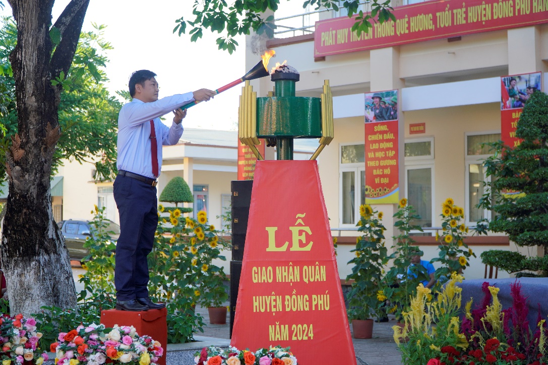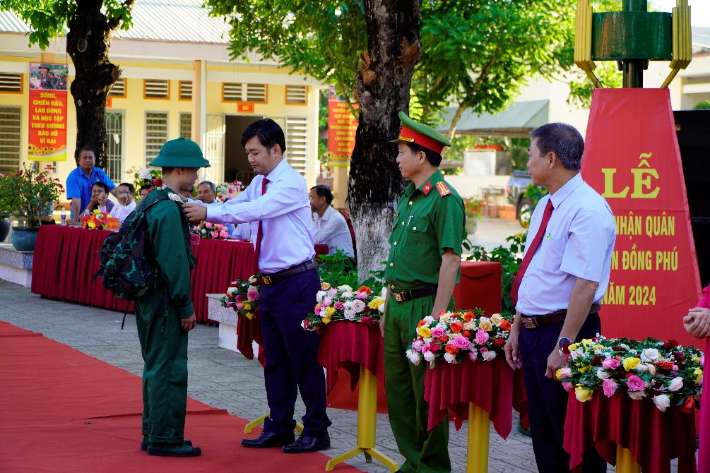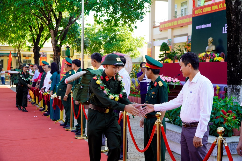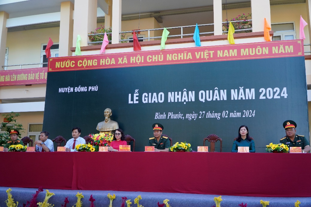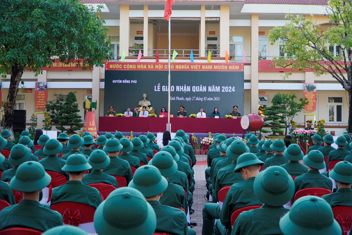 Sáng 27-2, huyện Đồng Phú long trọng tổ chức Lễ giao, nhận quân năm 2024, tiễn 160 thanh niên ưu tú của quê hương lên đường thực hiện nhiệm vụ xây dựng và bảo vệ tổ quốc. Tới dự có Tỉnh Uỷ viên, Giám đốc - Tổng biên tập Đài phát thanh - Truyền hình và Báo Bình Phước Nguyễn Thị Minh Nhâm, thành viên Hội đồng Nghĩa vụ Quân sự tỉnh; Thượng tá Vũ Mạnh Hùng, Phó Chỉ huy trưởng Bộ Chỉ huy Quân sự tỉnh. Về phía huyện Đồng Phú có Tỉnh uỷ viên, Bí thư Huyện uỷ Nguyễn Quốc Dũng; Phó bí thư thường trực Huyện uỷ, chủ tịch HĐND huyện Đinh Văn Kỹ; Phó bí thư Huyện uỷ, Chủ tịch UBND huyện, Chủ tịch Hội đồng NVQS huyện Nguyễn Anh Tuấn cùng lãnh đạo các cơ quan, ban, ngành, đoàn thể huyện, lãnh đạo các xã, thị trấn và đông đảo nhân dân trong huyện.