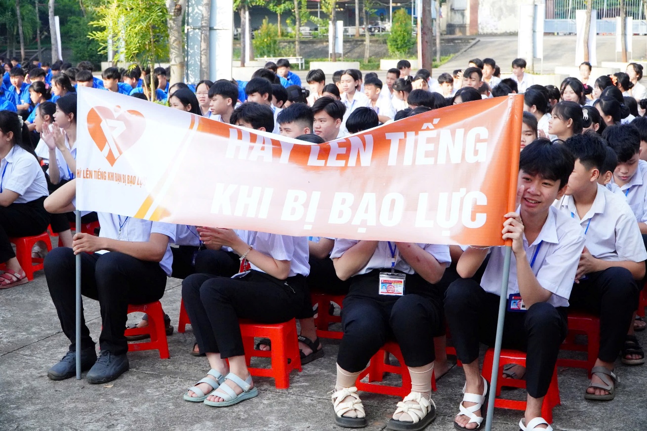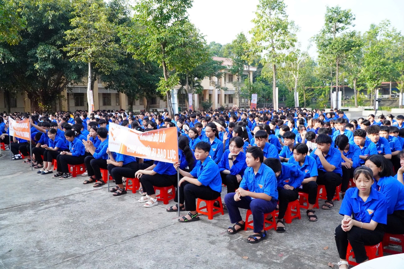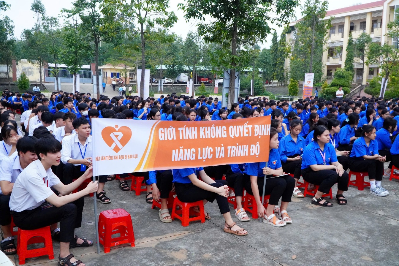 Đông đảo học sinh dự lễ với các khẩu hiệu tuyên truyền về công tác bình đẳng giới và phòng ngừa, ứng phó bạo lực trên cơ sở giới