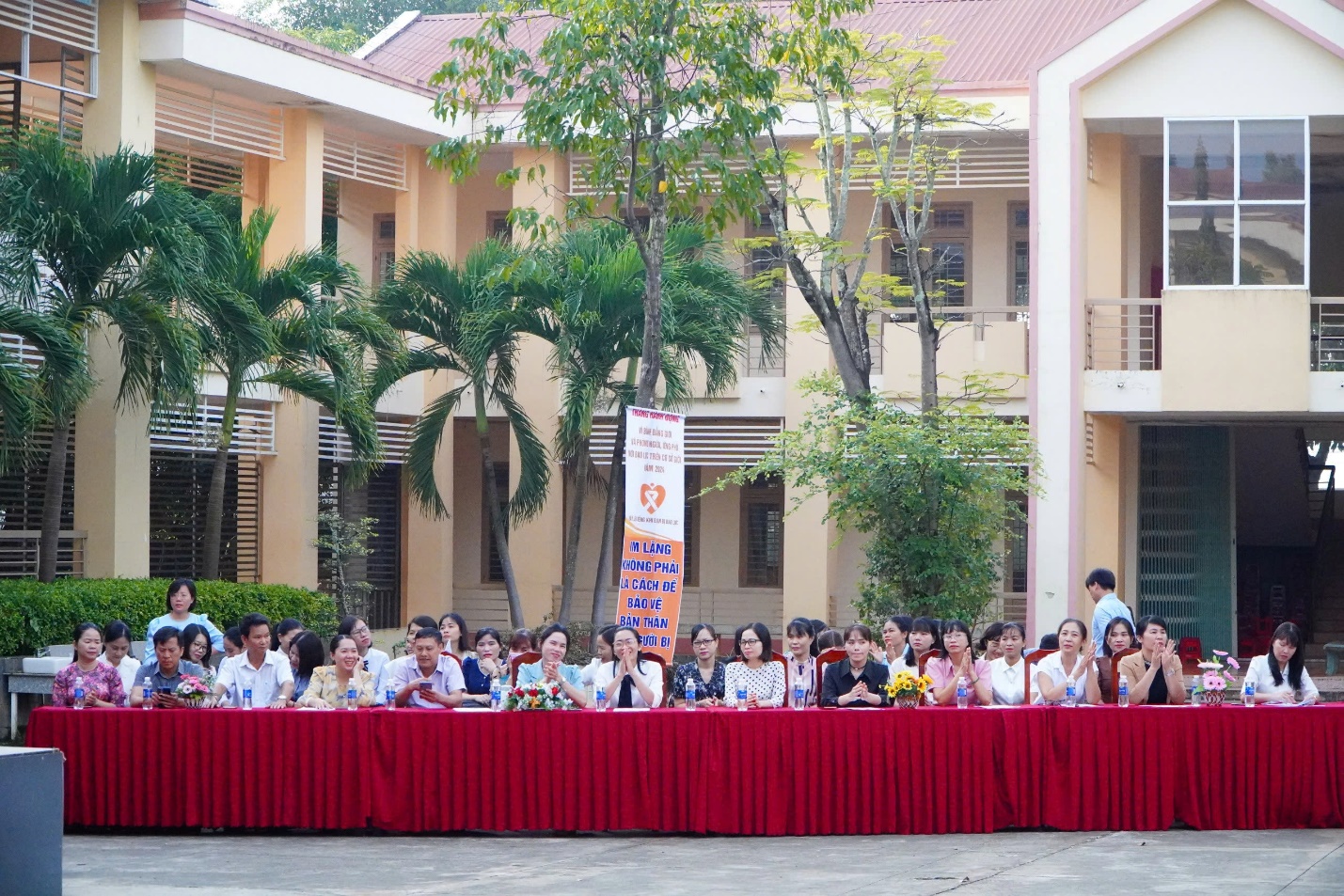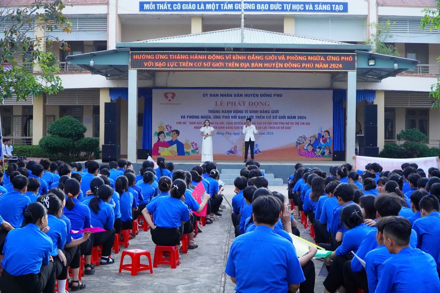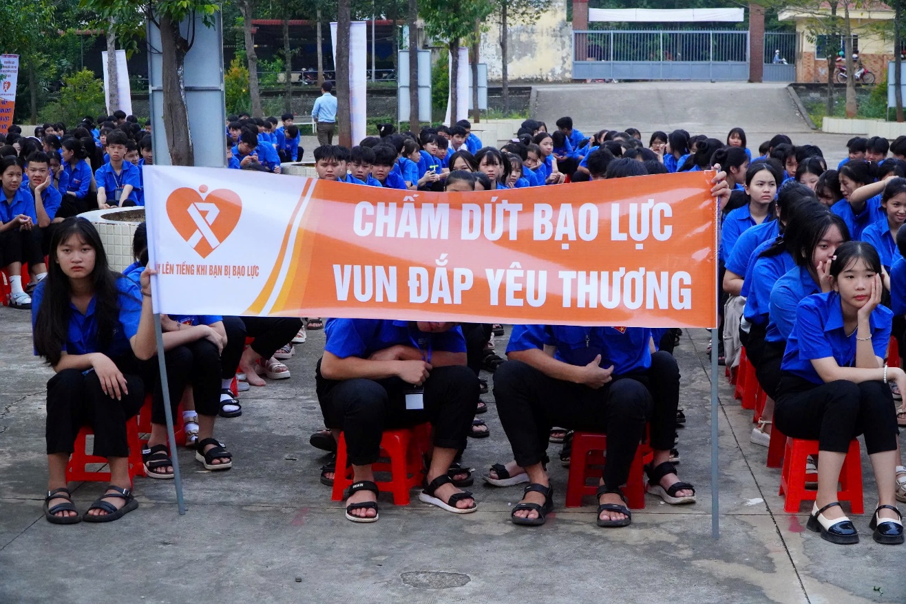 Đông đảo học sinh dự lễ với các khẩu hiệu tuyên truyền về công tác bình đẳng giới và phòng ngừa, ứng phó bạo lực trên cơ sở giới