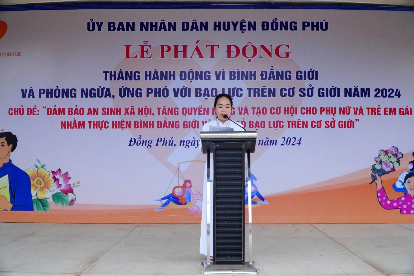Tại buổi lễ, lãnh đạo huyện Đồng Phú kêu gọi các cấp, các ngành và toàn xã hội quan tâm hơn nữa đến công tác bình đẳng giới, cần có những hành động cụ thể, thiết thực và trách nhiệm. Trong đó tập trung đẩy mạnh tuyên truyền về chủ đề, thông điệp và các hoạt động của Tháng hành động về bình đẳng giới; vận động Nhân dân đóng góp tích cực vào các chương trình, chính sách, pháp luật về bình đẳng giới, phòng, chống bạo lực đối với phụ nữ và trẻ em…