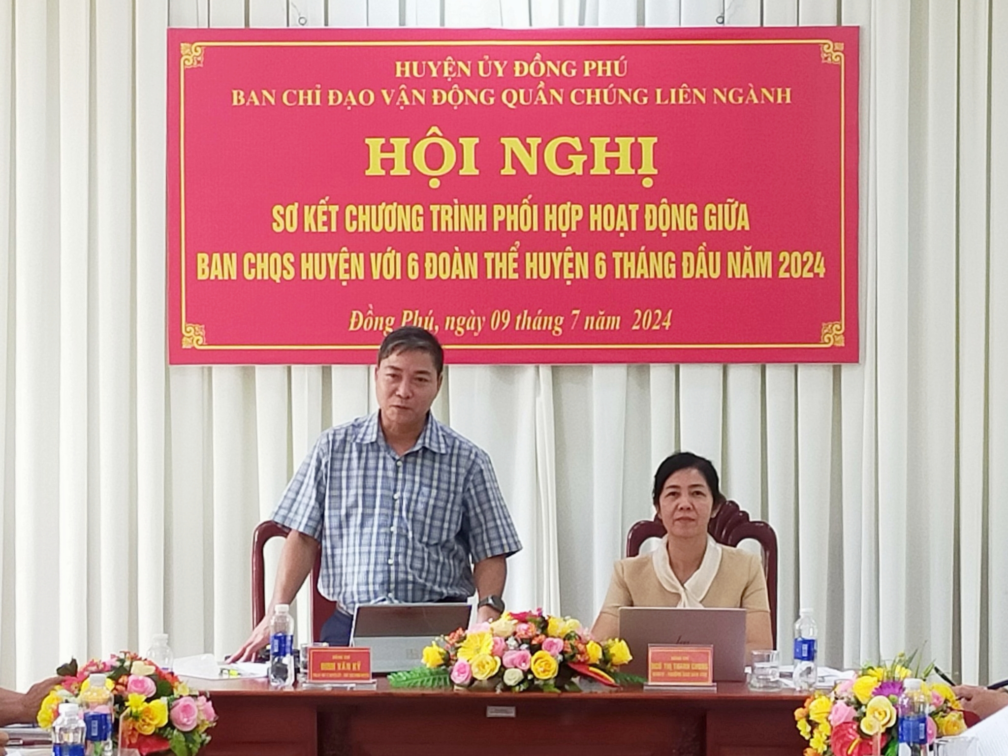 Chiều 9/7/, Ban chỉ đạo vận động quần chúng liên ngành huyện Đồng Phú đã tổ chức hội nghị sơ kết chương trình hoạt động giữa Ban chỉ huy quân sự với 6 đoàn thể huyện. Phó bí thư thường trực Huyện ủy, chủ tịch HĐND huyện Đinh Văn Kỹ; Ủy viên Ban thường vụ, Trưởng Ban dân vận Huyện ủy Ngô Thị Thanh Chung chủ trì hội nghị. Cùng dự còn có lãnh đạo Ban CHQS huyện, 6 đoàn thể huyện và Ban Chỉ đạo Vận động quần chúng liên ngành các xã, thị trấn.