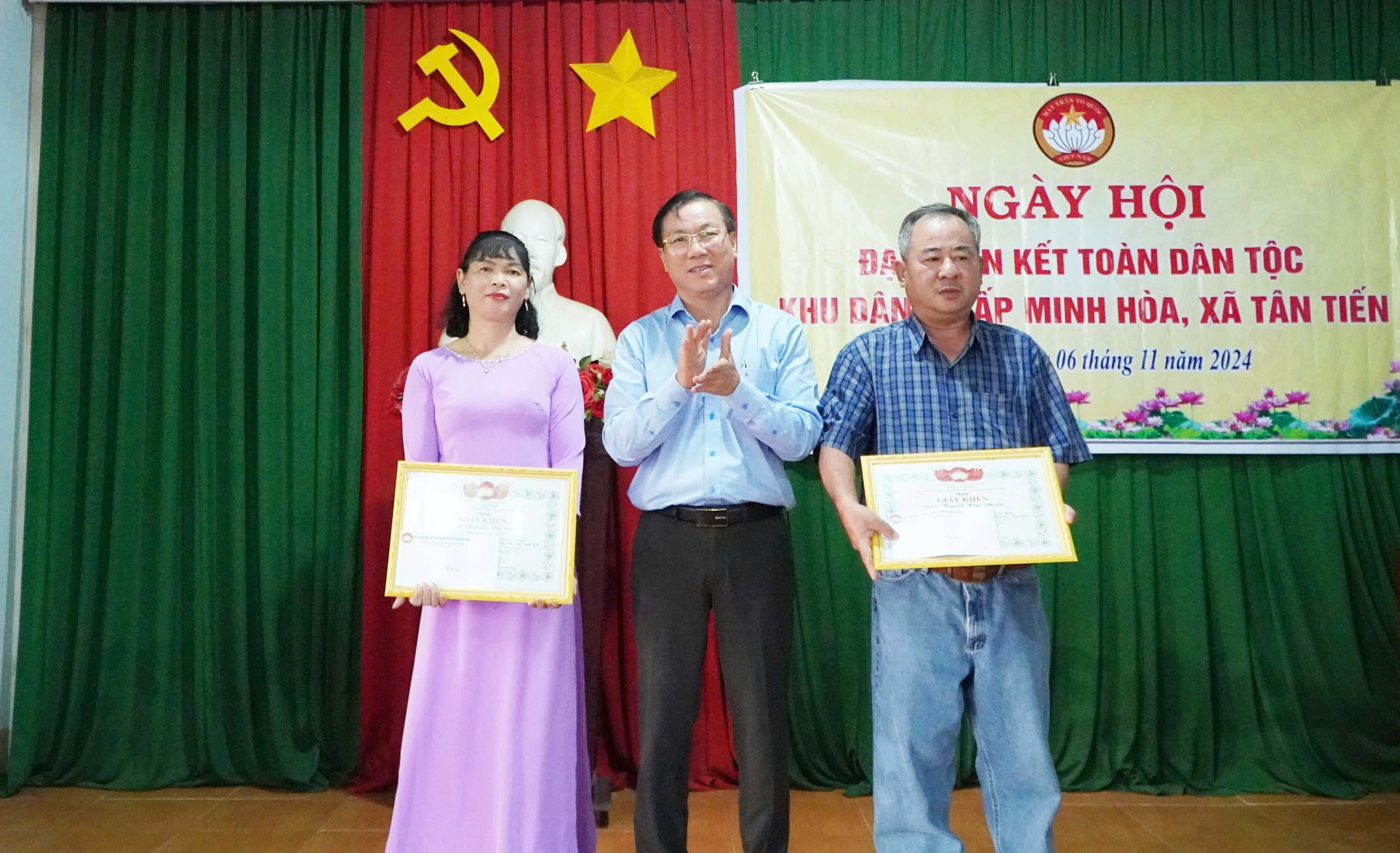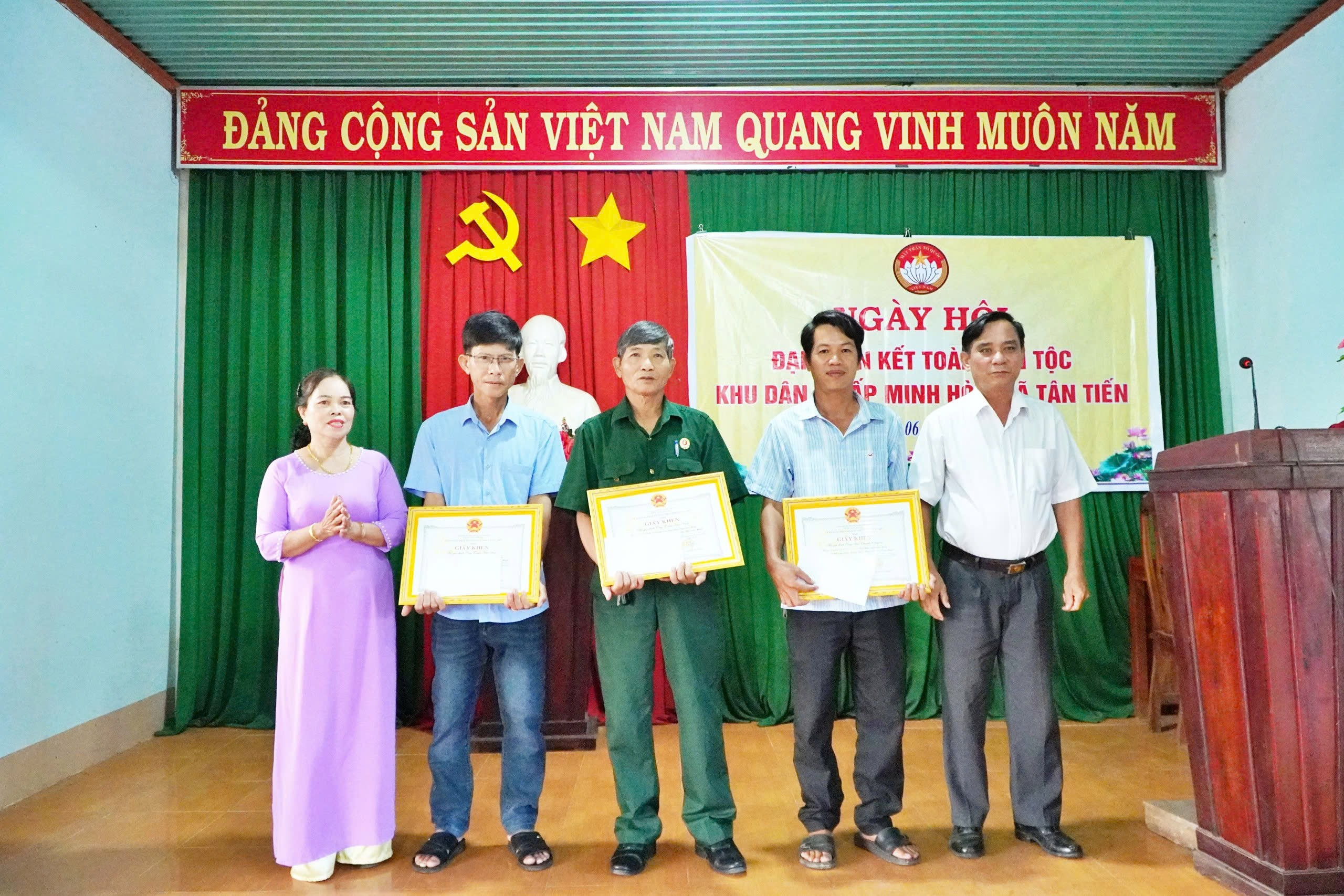 Dịp này, lãnh đạo MTTQ huyện, xã trao tặng giấy khen cho các gia đình văn hóa tiêu biểu ở khu dân cư ấp Minh Hòa.