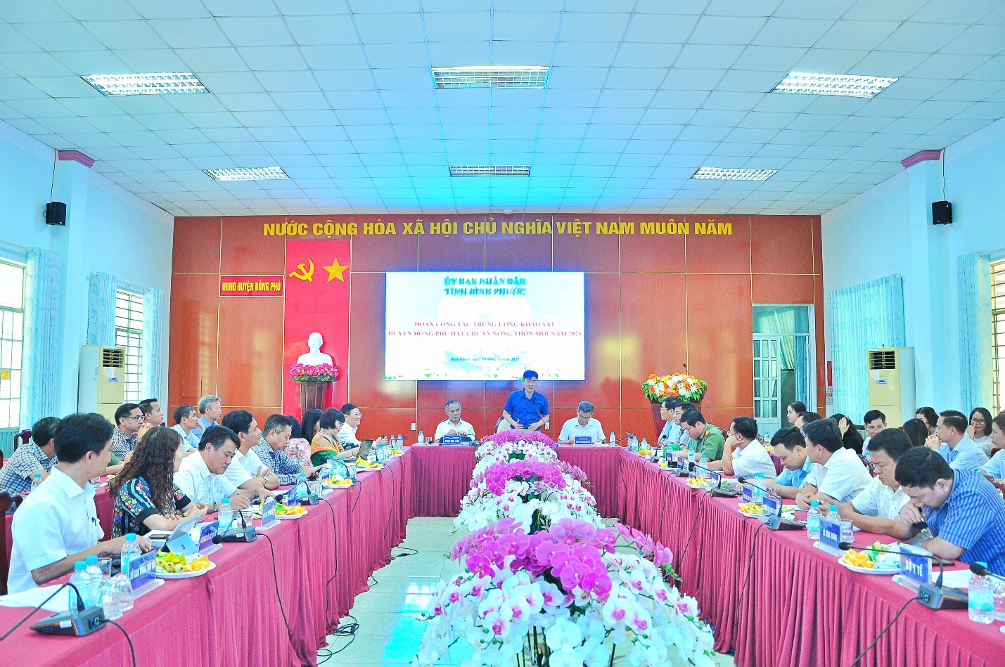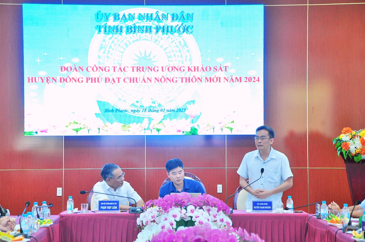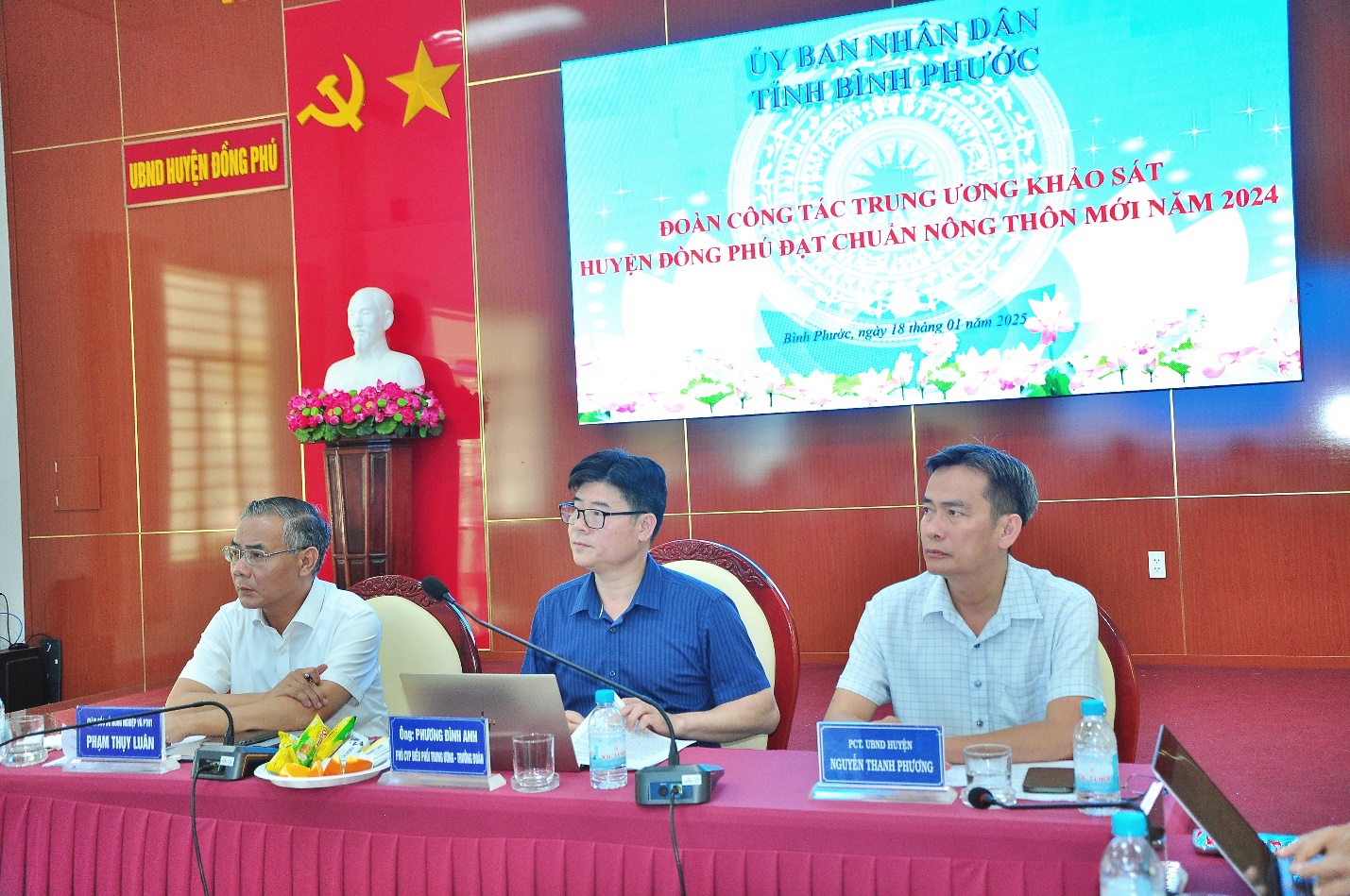 Kết luận đợt khảo sát, Phó Chánh văn phòng Điều phối Nông thôn mới Trung ương Phương Đình Anh đề nghị huyện Đồng Phú cần khẩn trương điều chỉnh, bổ sung hồ sơ báo cáo đầy đủ, số liệu phải chính xác, đồng bộ với hồ sơ thẩm tra của tỉnh. Bênh cạnh đó, các sở, ngành của tỉnh cũng cần hỗ trợ huyện tháo gỡ những khó khăn, vướng mắc ở các tiêu chí do ngành mình phụ trách, nhất là tiêu chí quy hoạch và chỉ tiêu trường chuẩn; phối hợp rà soát, thống nhất lại các số liệu trong hồ sơ thẩm định để gửi về bộ, ngành liên quan trong thời gian sớm nhất.