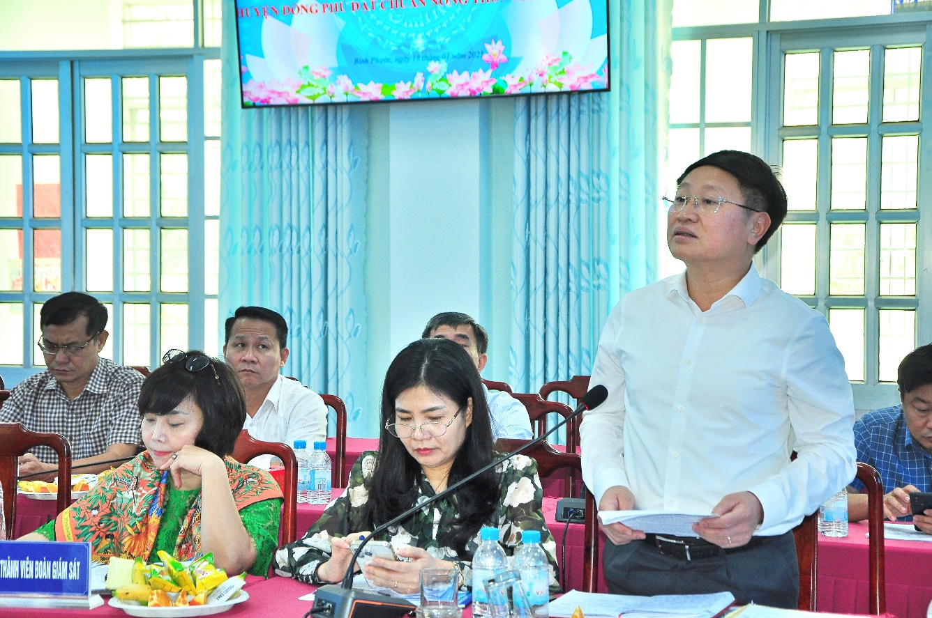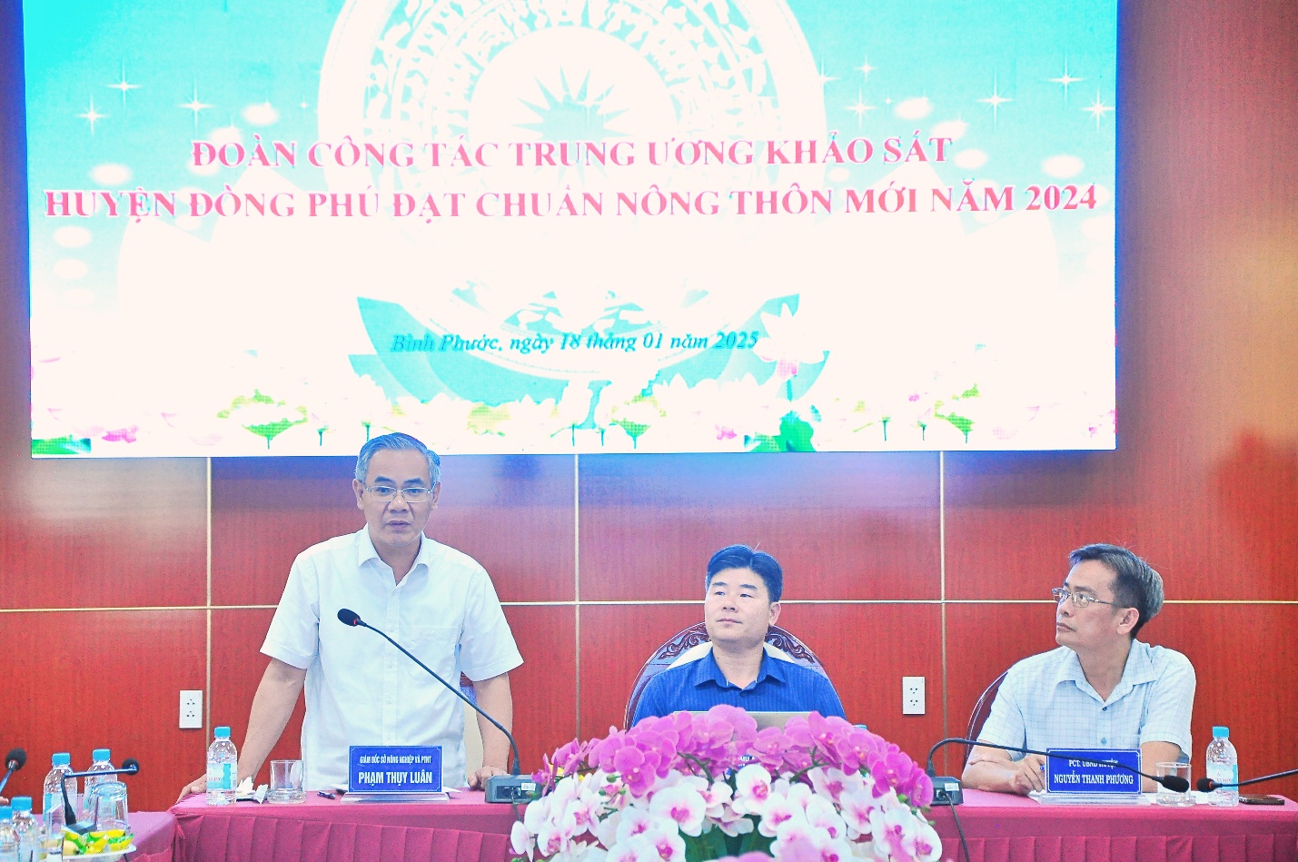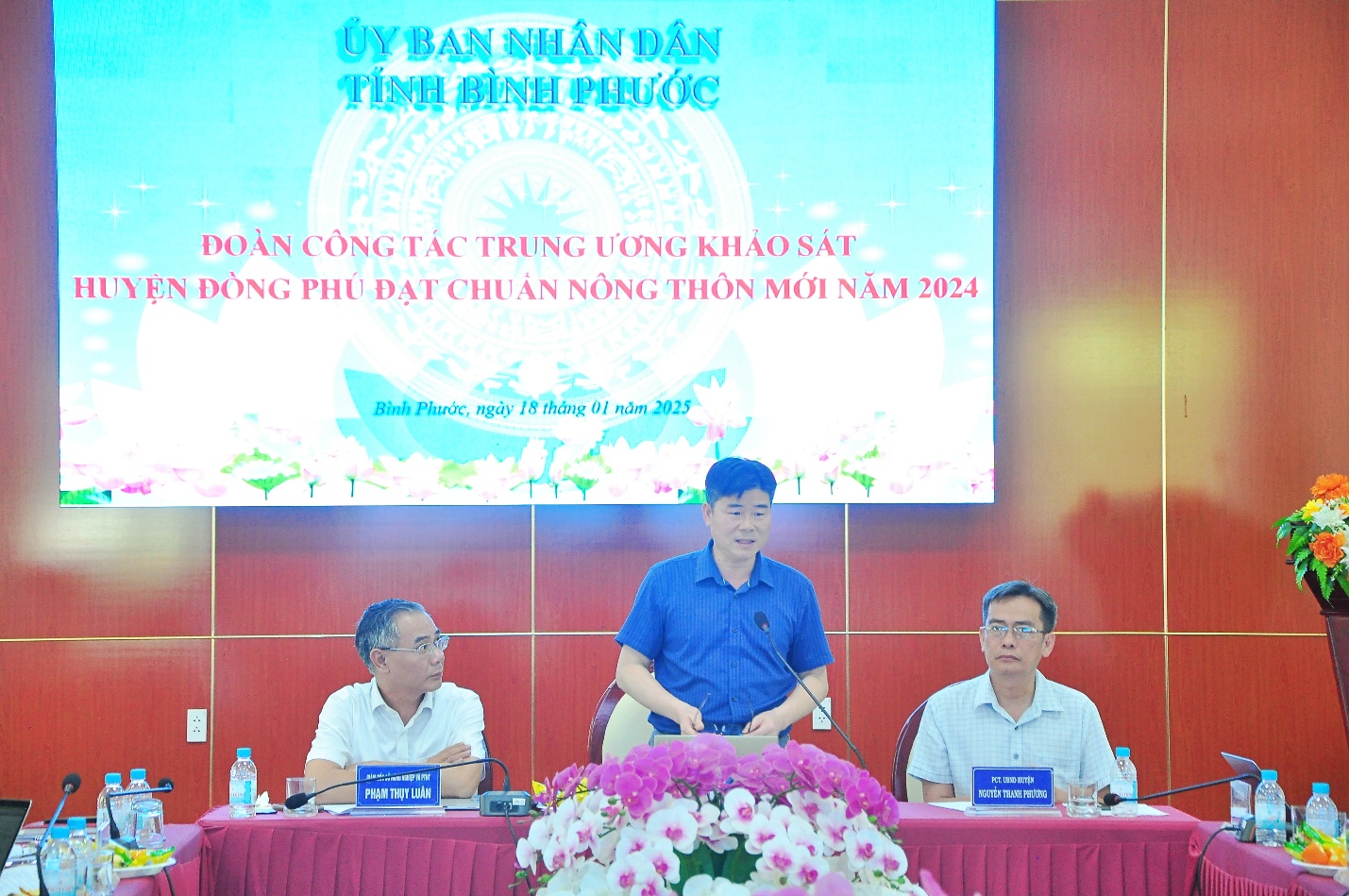 Kết luận đợt khảo sát, Phó Chánh văn phòng Điều phối Nông thôn mới Trung ương Phương Đình Anh đề nghị huyện Đồng Phú cần khẩn trương điều chỉnh, bổ sung hồ sơ báo cáo đầy đủ, số liệu phải chính xác, đồng bộ với hồ sơ thẩm tra của tỉnh. Bênh cạnh đó, các sở, ngành của tỉnh cũng cần hỗ trợ huyện tháo gỡ những khó khăn, vướng mắc ở các tiêu chí do ngành mình phụ trách, nhất là tiêu chí quy hoạch và chỉ tiêu trường chuẩn; phối hợp rà soát, thống nhất lại các số liệu trong hồ sơ thẩm định để gửi về bộ, ngành liên quan trong thời gian sớm nhất.