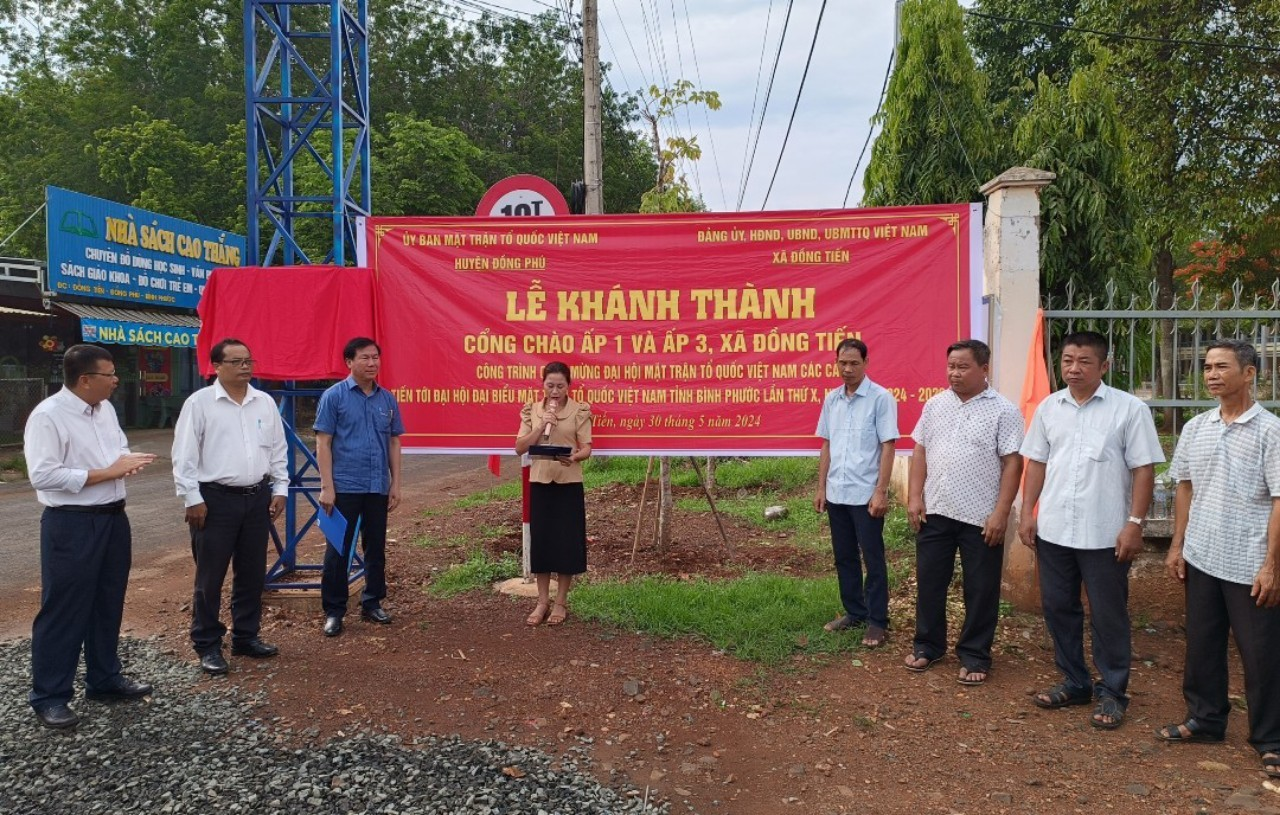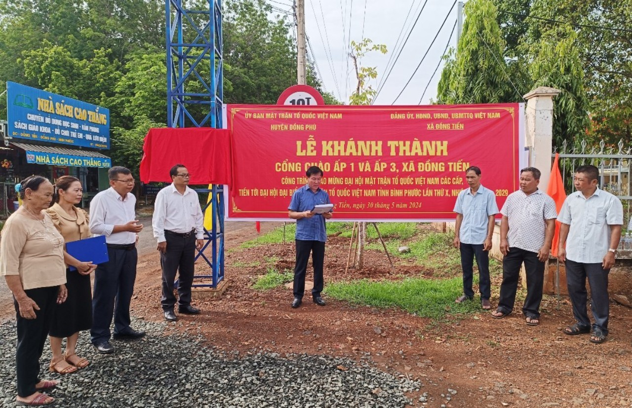 Thiết thực lập thành tích chào mừng Đại hội MTTQ Việt Nam huyện Đồng Phú, nhiệm kỳ 2024-2029, sáng nay 30-5-2024, Ủy ban MTTQ Việt Nam huyện Đồng Phú đã tổ chức lễ khánh thành công trình 02 cổng chào ấp 1 và ấp 3, xã Đồng Tiến. Dự buổi lễ có UVBTV Huyện ủy, Chủ tịch Ủy ban MTTQ Việt Nam huyện Đồng Phú Nguyễn Hữu Hùng, lãnh đạo xã Đồng Tiến, Chi bộ, Ban ấp 1 và ấp 3, xã Đồng Tiến.