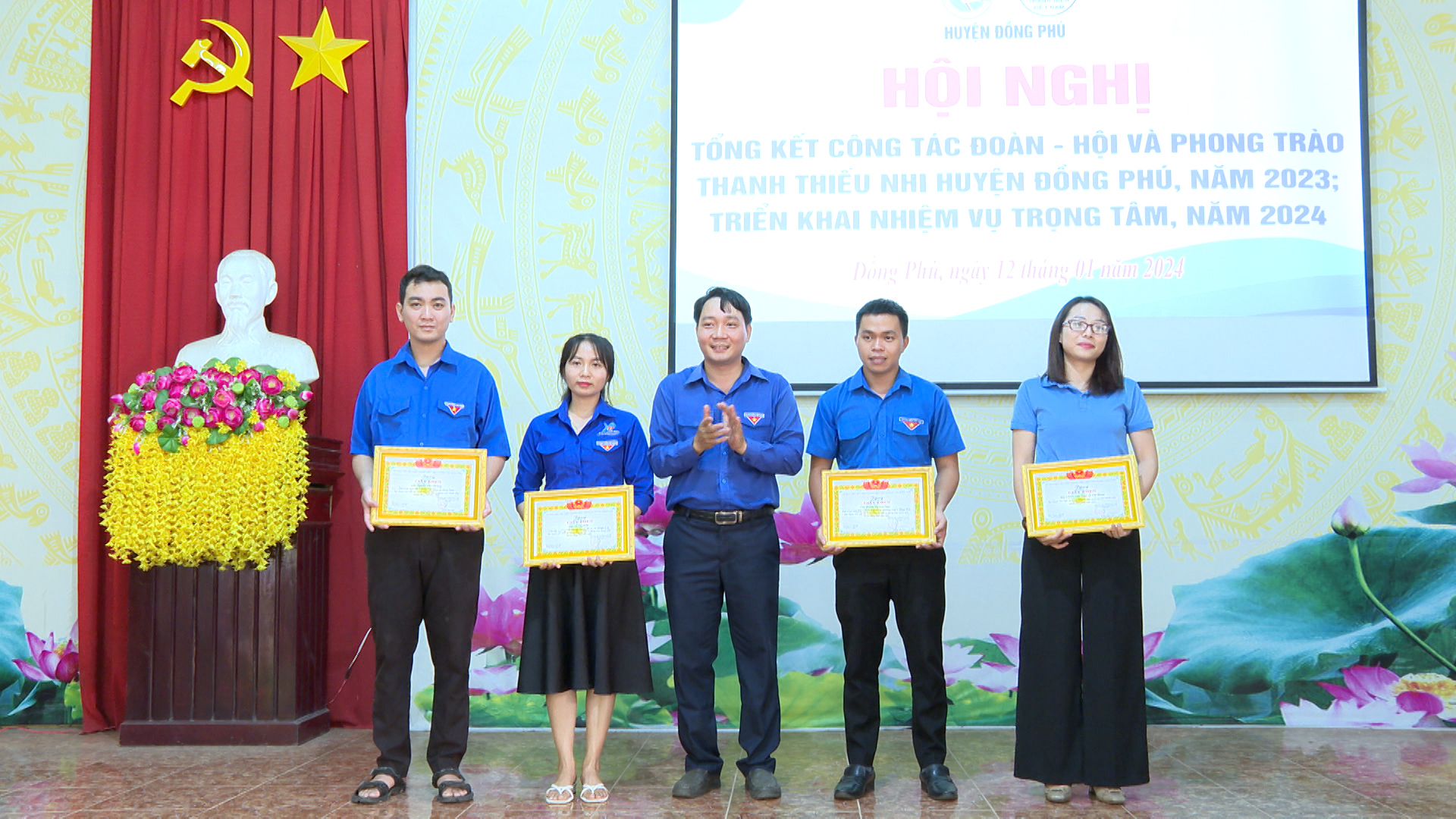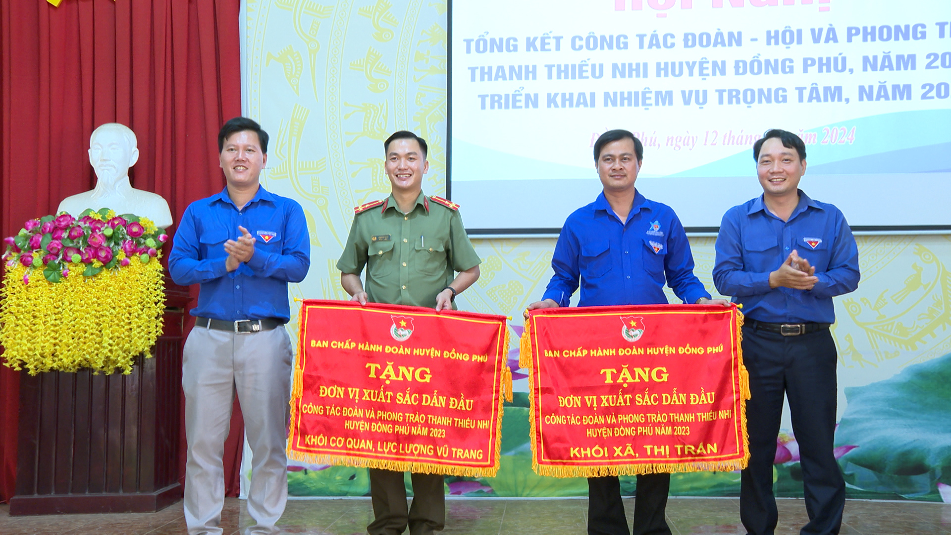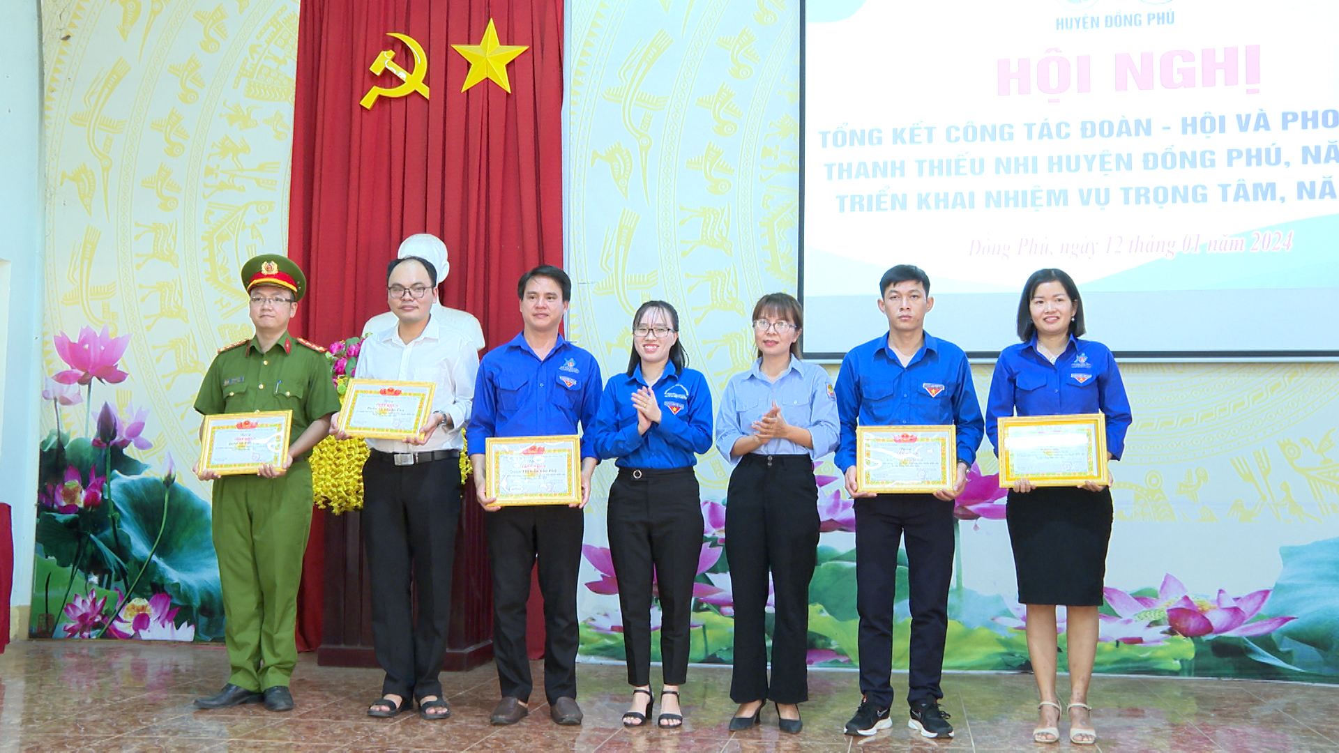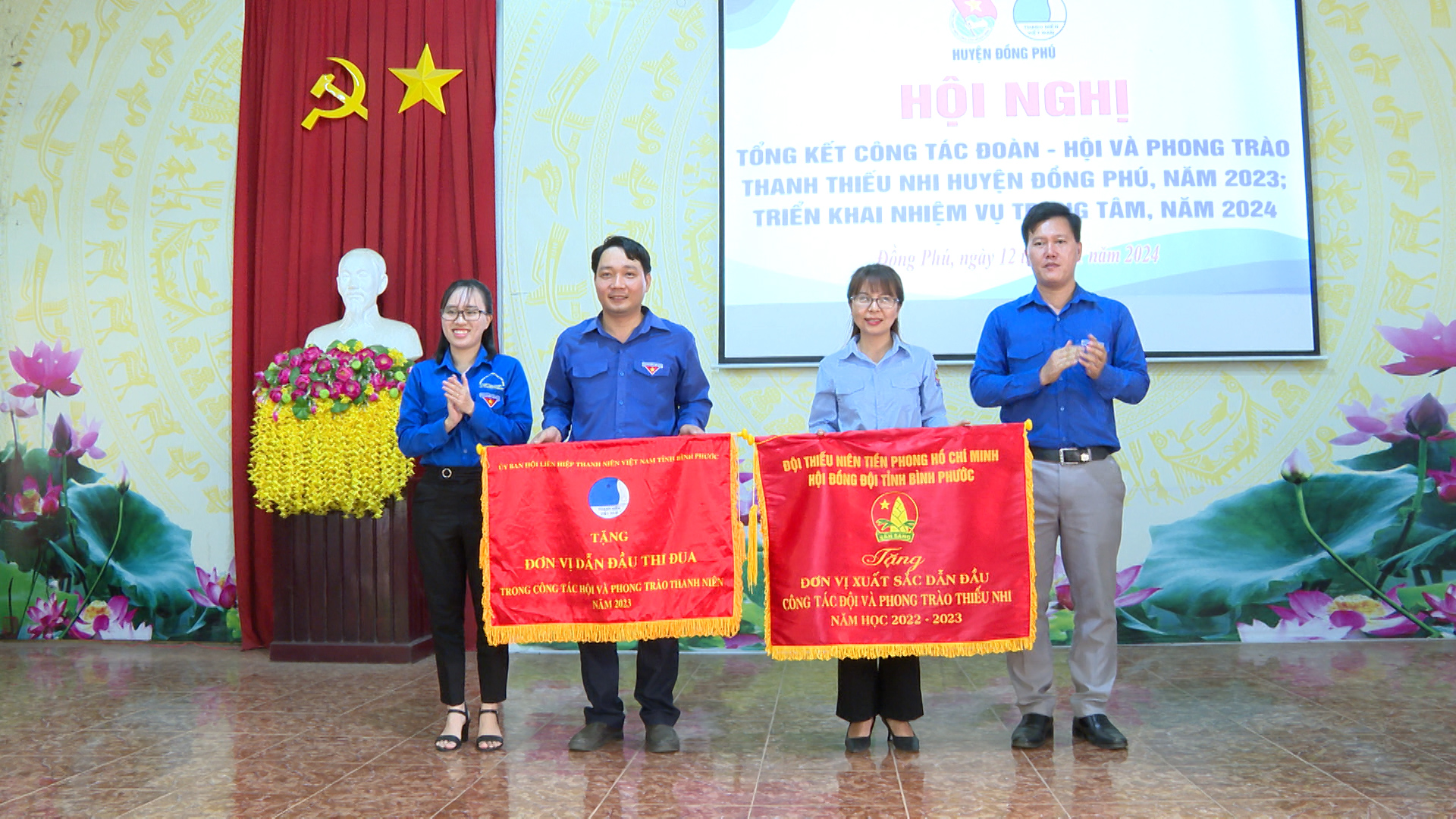 Với những kết quả đó, tại hội nghị, Tỉnh đoàn Bình Phước đã tặng cờ thi đua đơn vị dẫn đầu trong công tác hội và phong trào thanh niên năm 2023 cho Hội LHTN huyện; Hội Đồng đội tỉnh tặng cờ thi đua đơn vị dẫn đầu công tác đội và phong trào thiếu nhi cho Hội đồng đội huyện. Đồng thời khen thưởng cho các tập thể, cá nhân có thành tích xuất sắc trong công tác Đoàn, Hội năm 2023; tổ chức ký kết giao ước thi đua giữa các cơ đoàn năm 2024 và tặng mỗi đơn vị 1 tấm bản đồ Việt Nam.