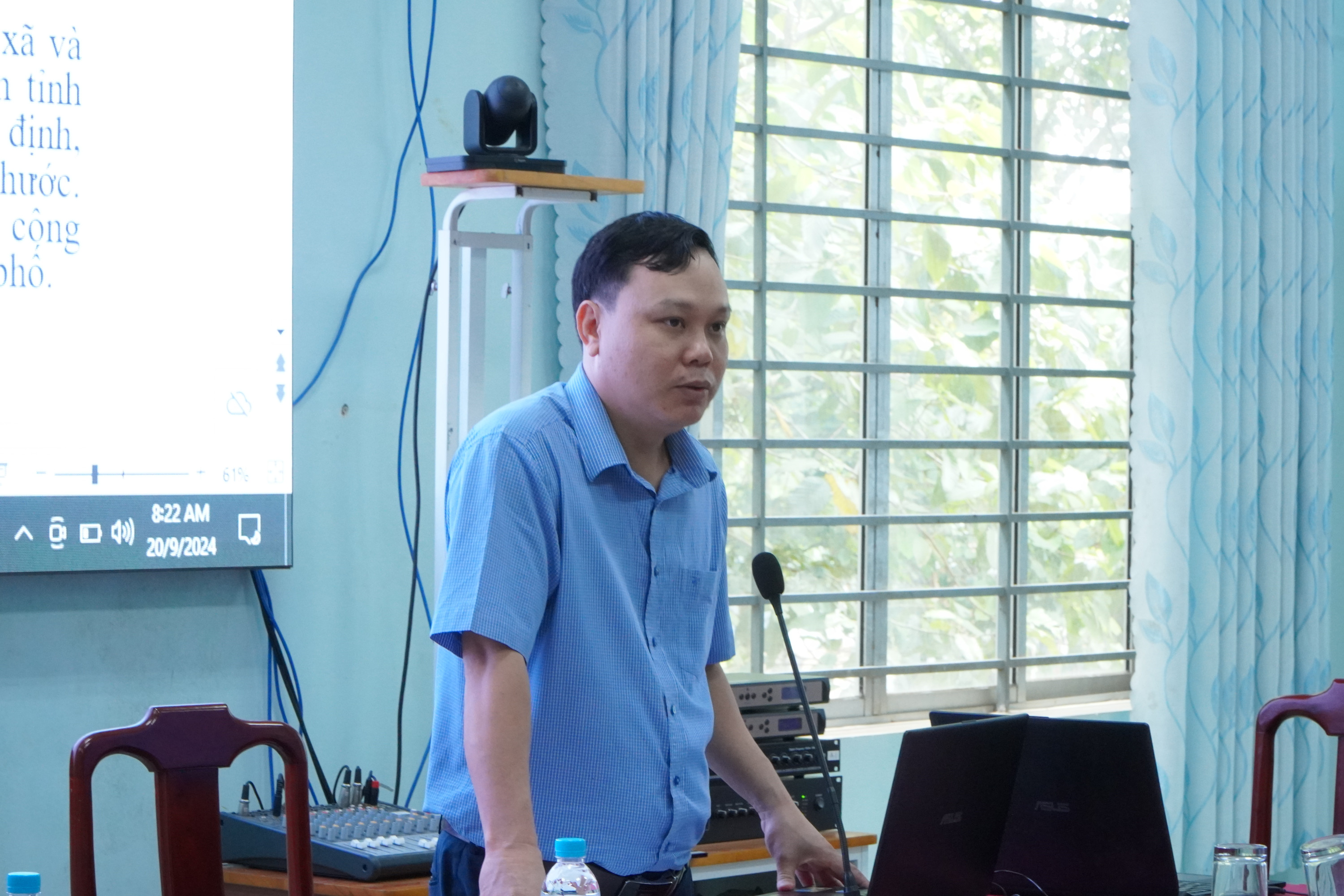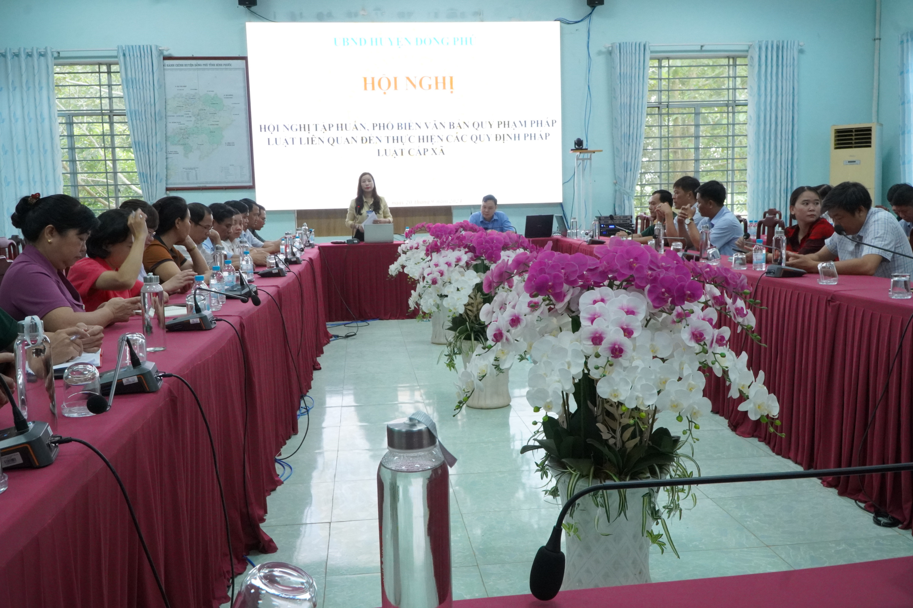 Tại hội nghị, ông Trịnh Quang Hạnh, Trưởng Phòng phụ trách Xây dựng chính quyền, Công tác thanh niên, cải cách hành chính, văn thư lưu trữ của Sở Nội vụ - báo cáo viên cấp tỉnh phổ biến, tập huấn nội dung các văn bản quy phạm pháp luật của Quốc hội, Chính phủ, Hội đồng nhân dân tỉnh và Ủy ban nhân dân tỉnh vừa ban hành liên quan tới số lượng, chất lượng, tiêu chuẩn các chức danh, chế độ, chính sách đối với cán bộ, công chức và người hoạt động không chuyên trách ở cấp xã, ở thôn ấp, khu phố; việc phân cấp quản lý; Quy chế tổ chức tuyển dụng công chức cấp xã. Phổ biến, tập huấn các văn bản quy phạm pháp luật: Luật Thực hiện Dân chủ ở cơ sở ngày 10/11/2022; Nghị định số 59/2023/NĐ-CP ngày 14/8/2023 của Chính phủ quy định chi tiết một số điều của luật thực hiện dân chủ ở cơ sở; Nghị định số 33/2023/NĐ-CP ngày 10/6/2023 của Chính phủ quy định về cán bộ, công chức cấp xã và người hoạt động không chuyên trách ở cấp xã, ở thôn, tổ dân phố; Triển khai các quy định về cán bộ, công chức cấp xã và người hoạt động không chuyên trách ở xã, phường trên địa bàn tỉnh Bình Phước.