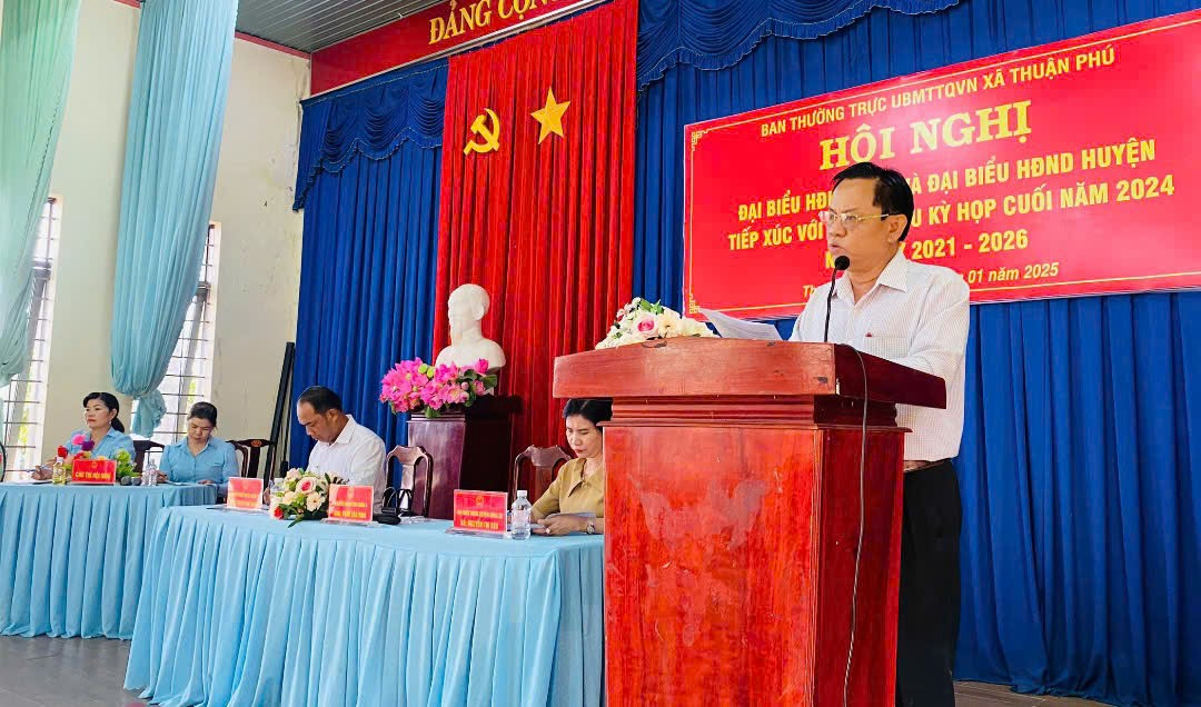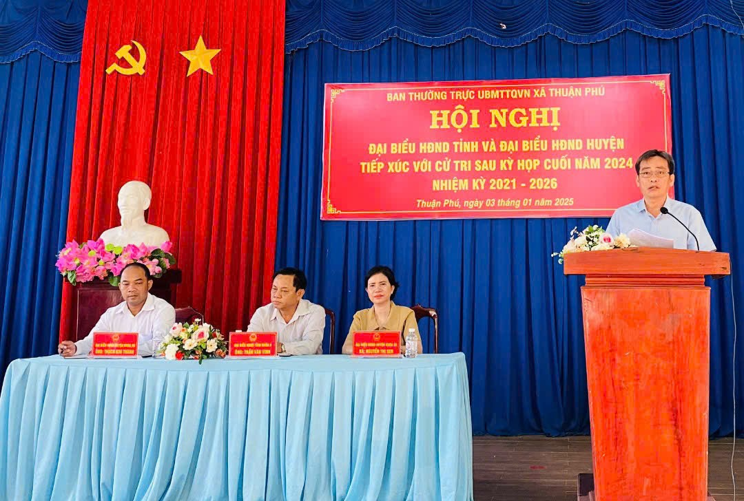 Tại hội nghị, đại biểu HĐND tỉnh, huyện báo cáo kết quả kỳ họp cuối năm 2024 và trả lời các ý kiến của cử tri trong đợt tiếp xúc trước. Sau đó, cử tri xã Thuận Phú đã tham gia 5 ý kiến, với các nội dung: Cử tri ấp Đồng Búa kiến nghị về hệ thống đường điện còn yếu, 3 tuyến đường chưa được bê tông hóa, nhà văn hóa chưa có loa phát thanh. Một số ý kiến khác phản ánh về Tuyến đường tổ B ấp Bù Xăng xuống cấp cần được sửa chữa, công tác hỗ trợ kinh phí cho gia đình có heo bị tiêu hủy do dịch còn chậm, công tác cấp giấy chứng nhận quyền sử dụng đất còn nhiều khó khăn, …