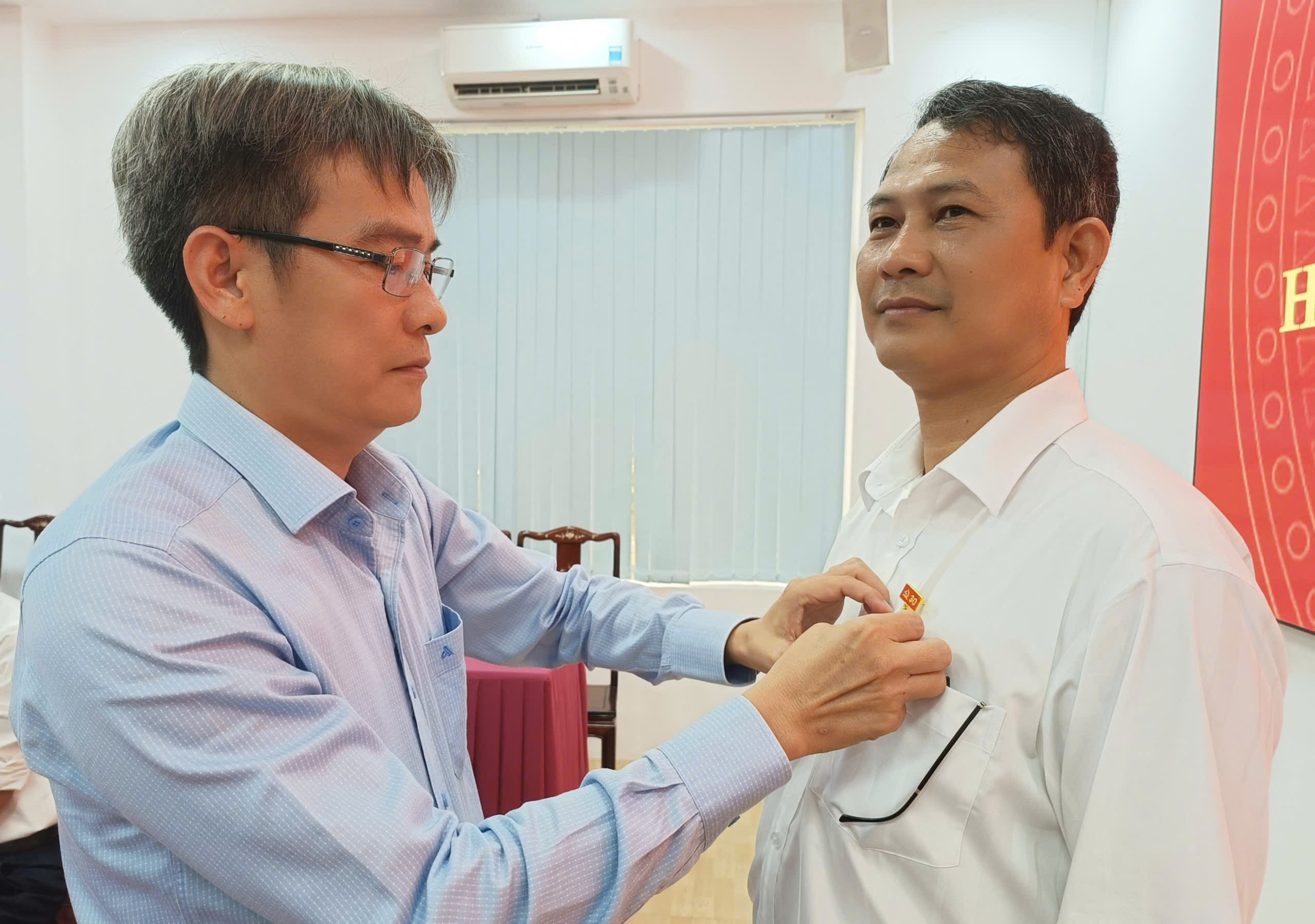 Đồng chí Nguyễn Thanh Phương, UVBTV Huyện ủy, Phó Chủ tịch UBND huyện, Bí thư chi bộ trao huy hiệu 30 năm tuổi đảng cho đồng chí Phạm Hữu Hùng